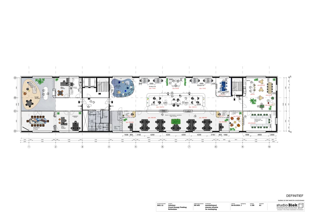 - Airconditioning, mechanische ventilatie, topkoeling, inbouwarmaturen, liften, te openen ramen, kabelgoten, systeemplafond, toilet, pantry, verwarming en kamerindeling