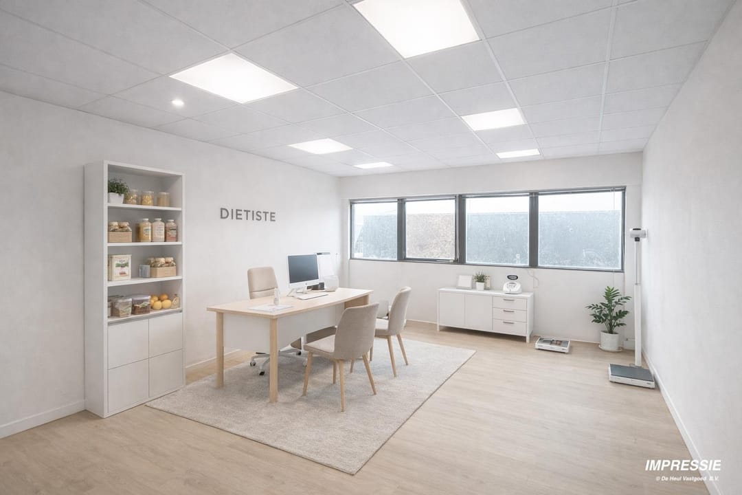 - Airconditioning, inbouwarmaturen, te openen ramen, kabelgoten, systeemplafond, toilet, pantry, verwarming en kamerindeling