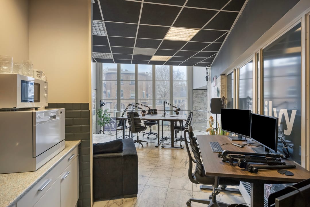 De kantoorruimte heeft veel natuurlijk lichtinval dankzij de geheel glazen wand aan de zijkant van het gebouw.