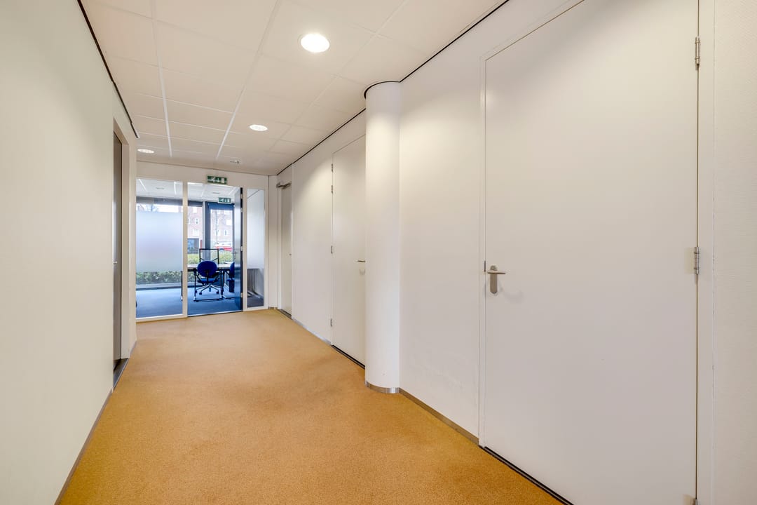 De kantoorruimte is afgewerkt met tapijt, terwijl de natte ruimten zijn voorzien van een tegelvloer. Het geheel beschikt over een systeemplafond met geïntegreerde verlichtingsarmaturen.