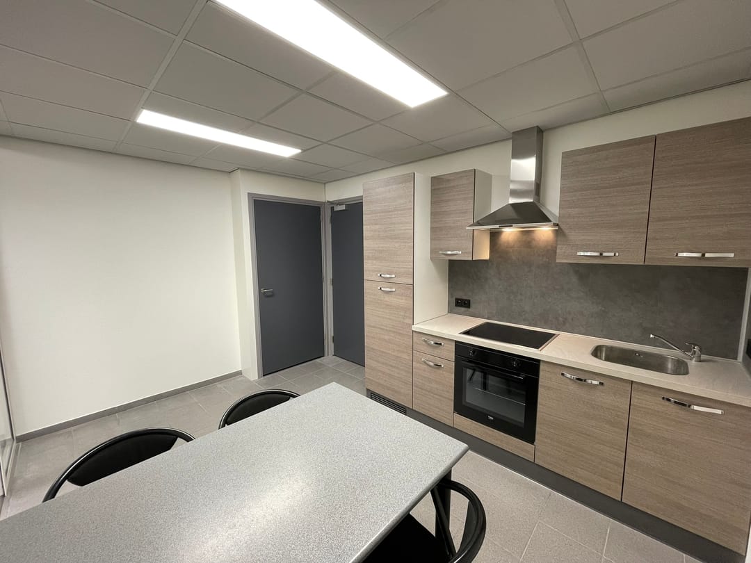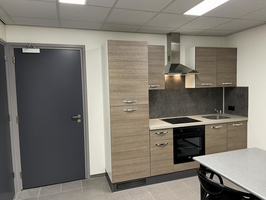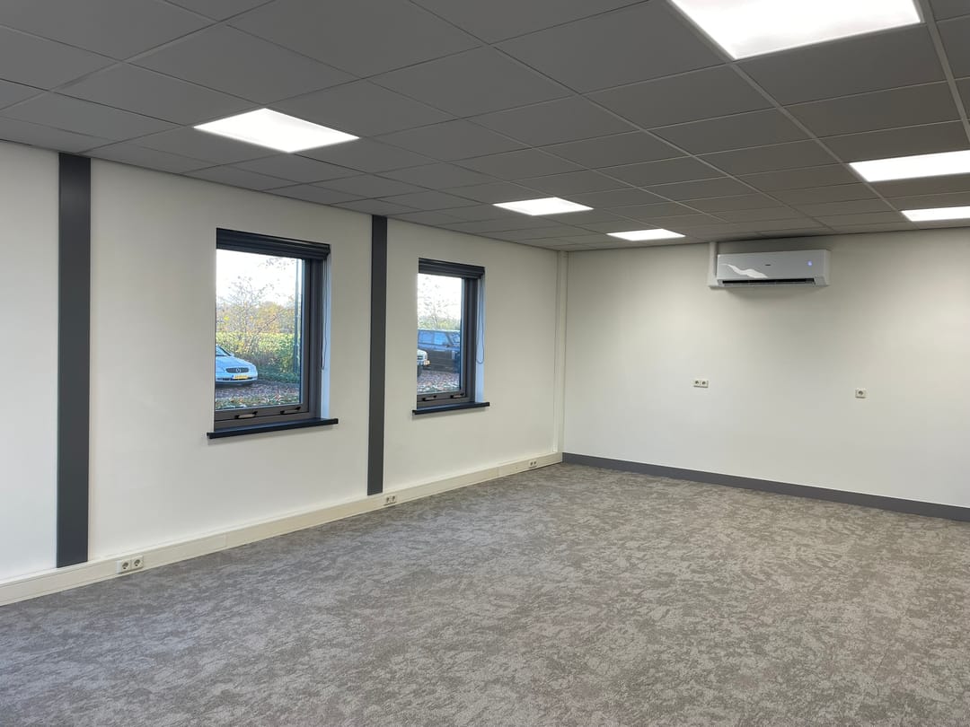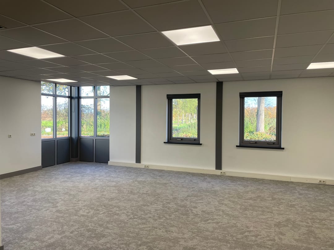 Binnenkomst via dubbele toegangsdeur in ruim portaal. Vanuit dit portaal stap je binnen in de royale, hoogwaardig afgewerkte kantoorruimte. De kantoorruimte is voorzien van nieuw schilderwerk, nieuwe akoestische plafondplaten, nieuwe rolgordijnen, twee airco’s voor koelen én verwarmen, een nieuwe tapijtvloer en een handige inbouwkast. Vanuit het kantoor betreed je de pantry met keuken voorzien van koelkast, inductie kookplaat, oven, vaatwasser en boiler. Aansluitend aan de pantry is een volledig nieuw toilet gerealiseerd.