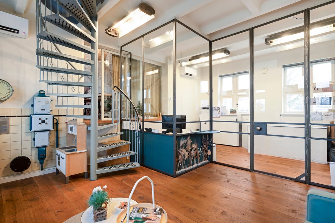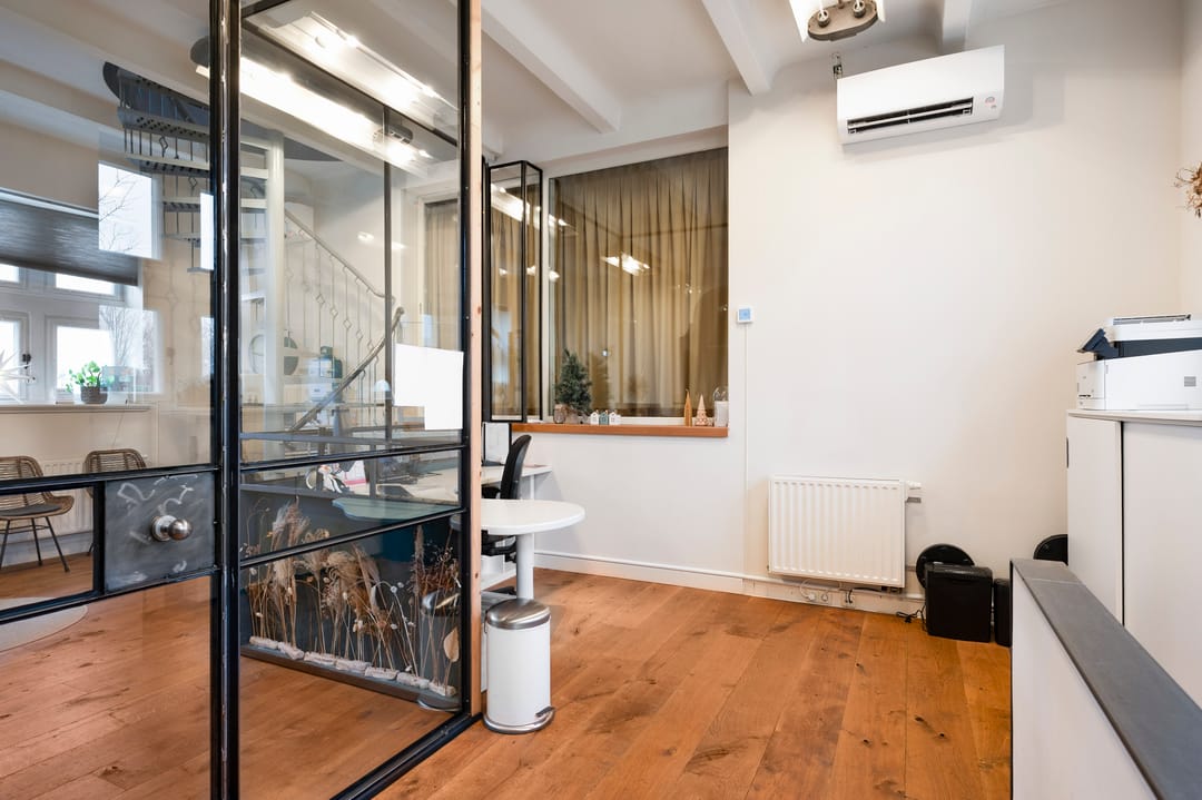 Middels authentieke houten deur is de kantoorruimte toegankelijk. Ruime ontvangsthal/kantoorruimte (ca. 36,5 m²) heeft veel lichtinval en een hoogte van ca. 3,3m. Via moderne wenteltrap is de directie-/spreekkamer (ca. 18,9 m²) op de tussenvloer te bereiken. In deze ruimte zijn de ramen bewerkt met een zonwerende en verkoelende folie. De eerste verdieping is ca. 60 m² open kantoorruimte. Met de zichtbare draagbalken heeft deze verdieping een open en ruime uitstraling. Vanuit de ontvangsthal is er tevens toegang tot de kelder waarin de kitchenette bevindt. De toiletruimte is naast de entree gesitueerd.