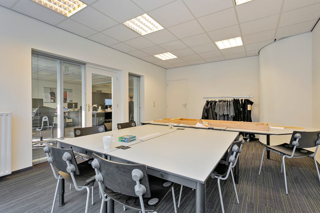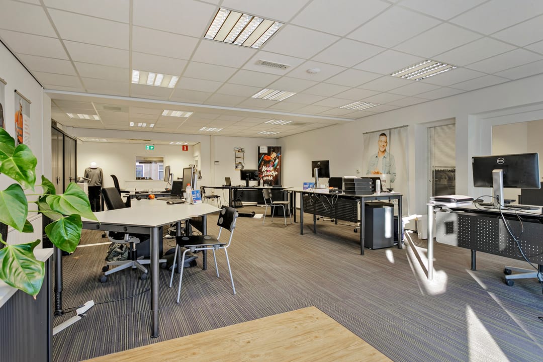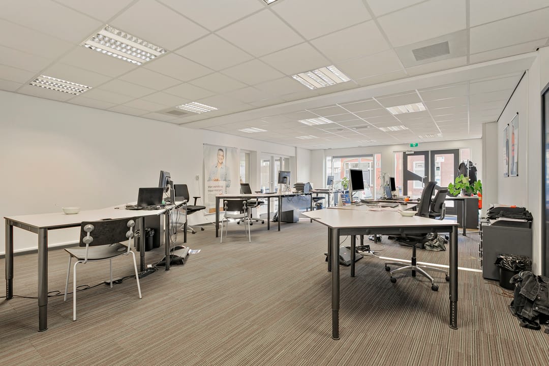 De kantoorruimte is afgewerkt met systeemplafonds voorzien van inbouwverlichting en projecttapijt op de vloer, wat zorgt voor een nette en professionele uitstraling.