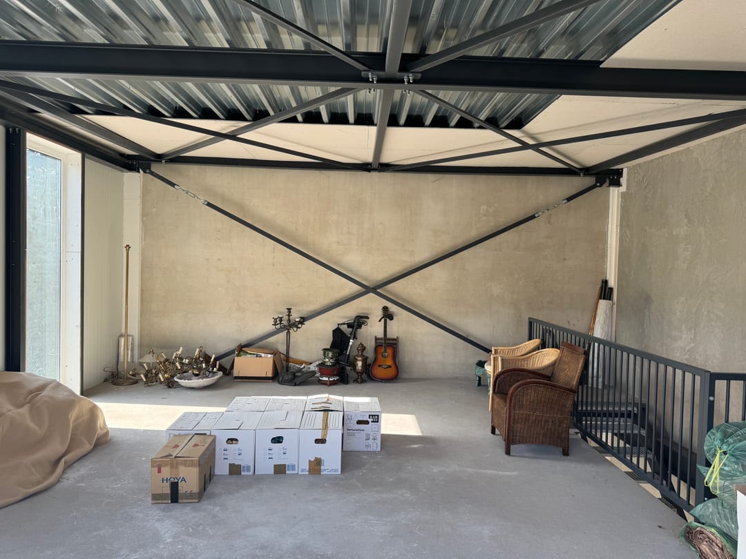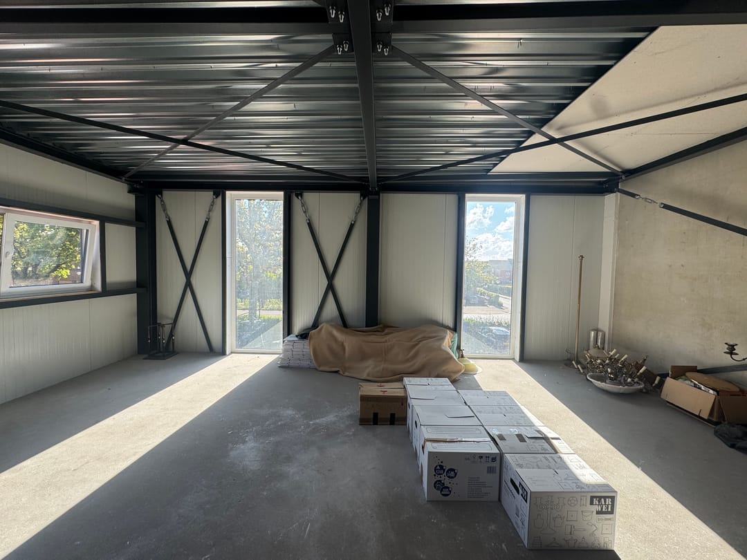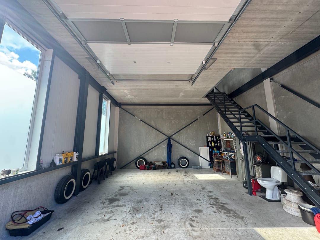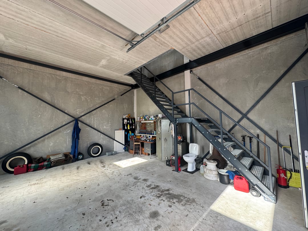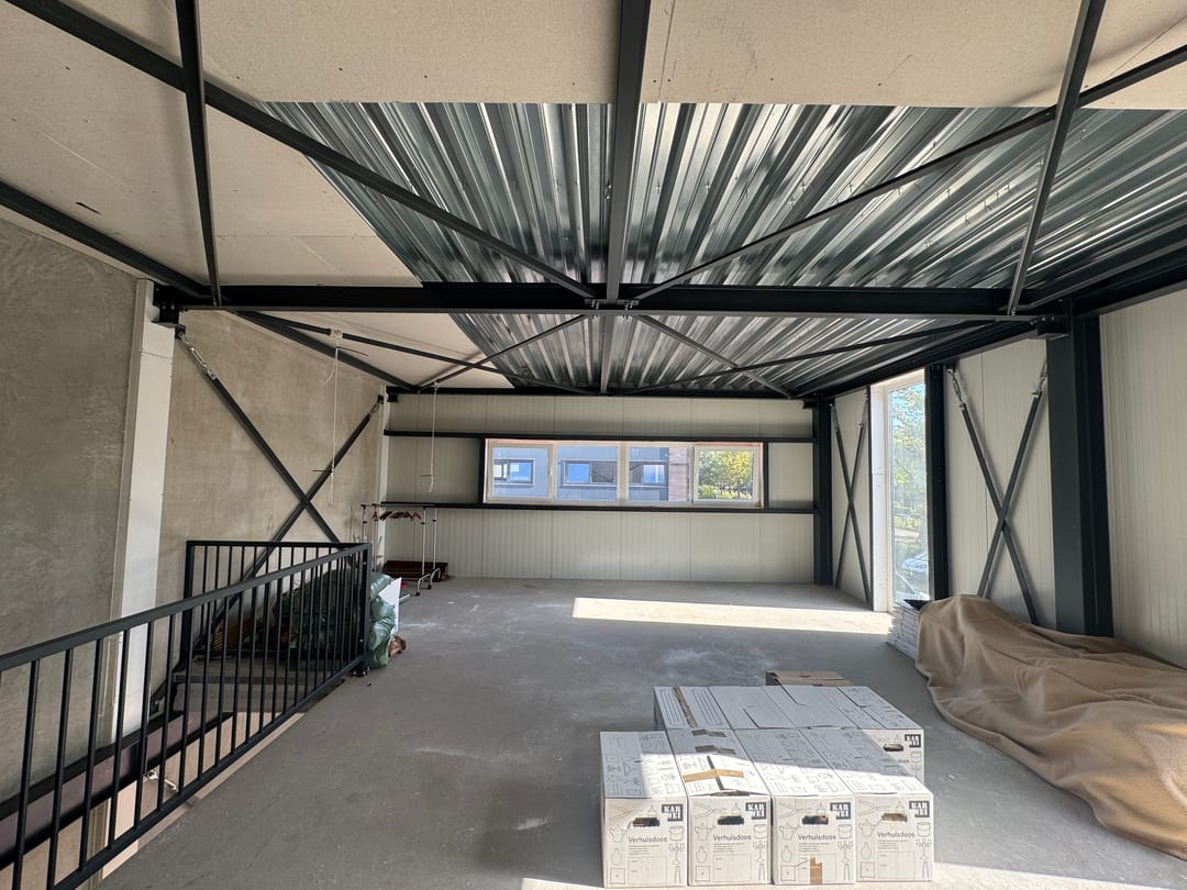 De unit wordt opgeleverd met vaste trap, overheaddeur, meterkast en losstaand toilet.