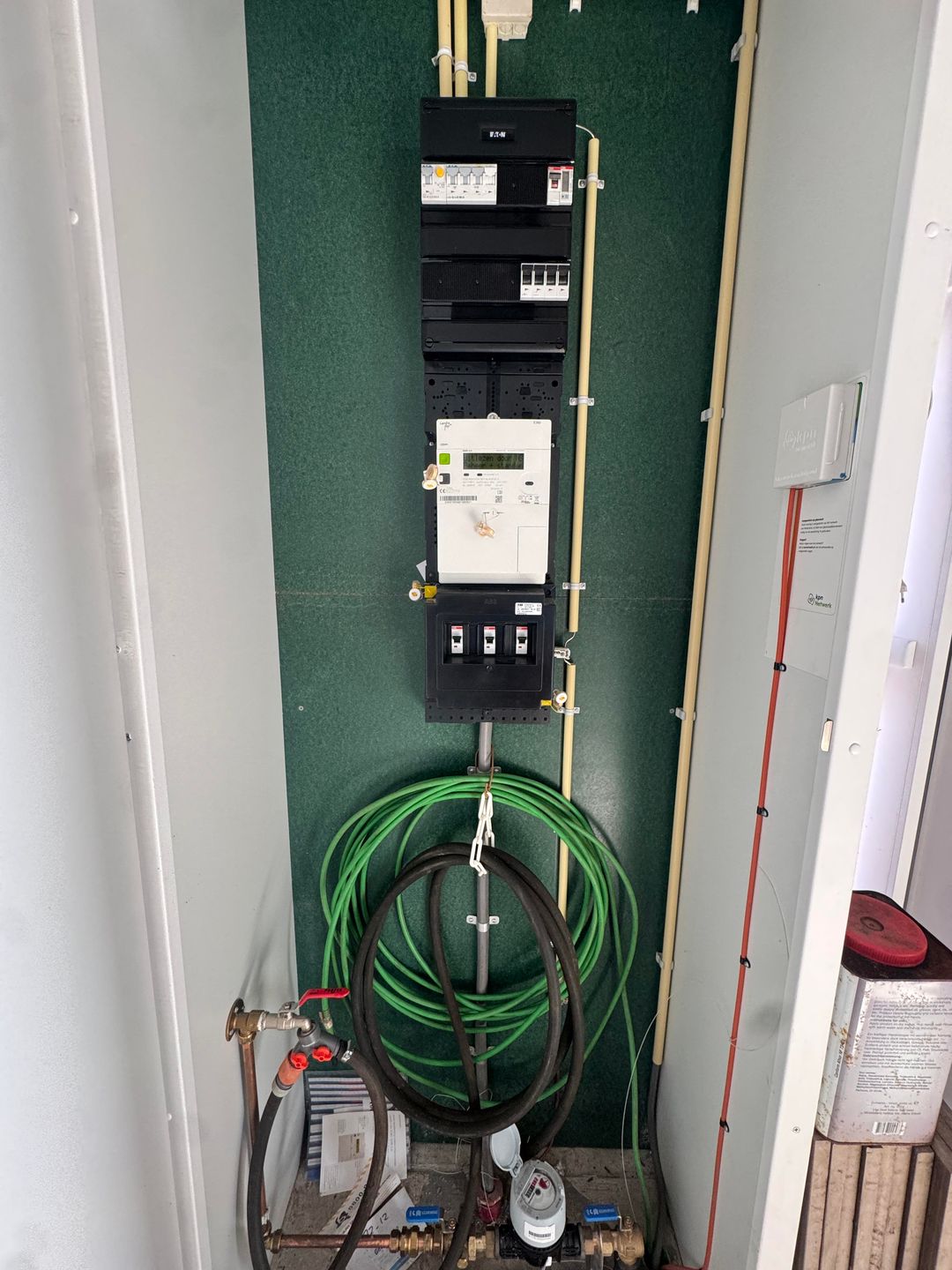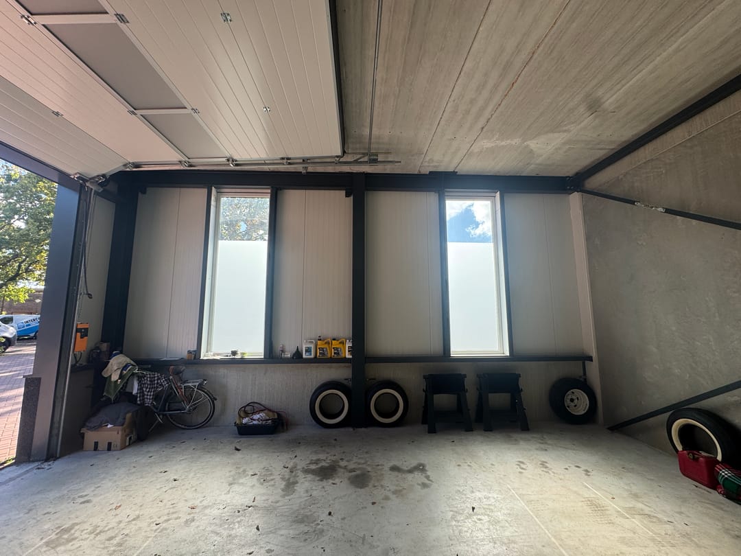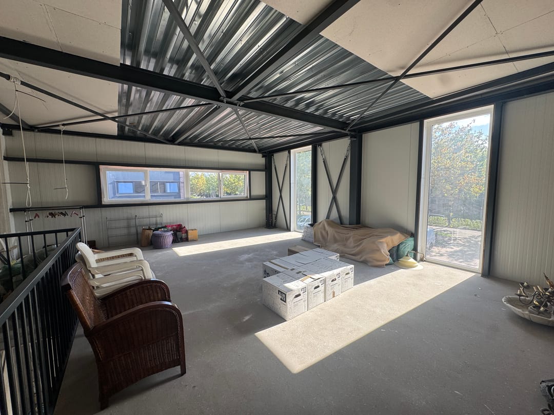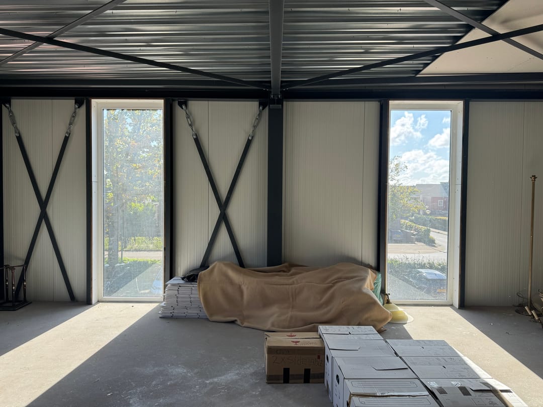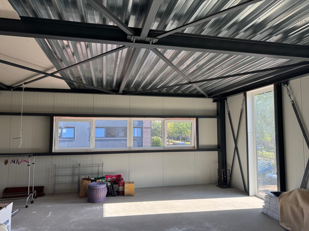 De unit wordt opgeleverd met vaste trap, overheaddeur, meterkast en losstaand toilet.