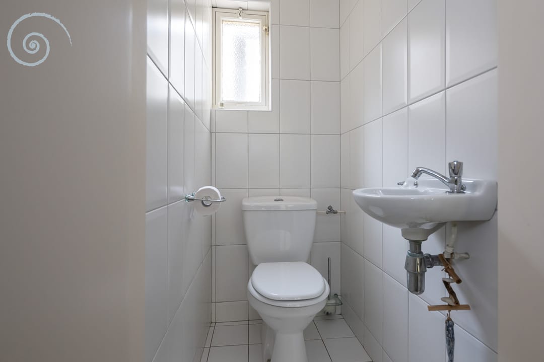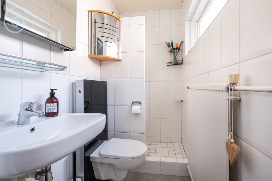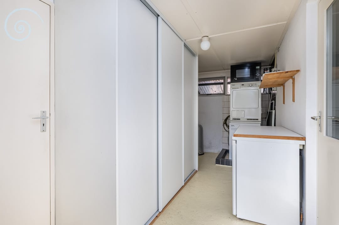 Daarnaast is er een separate toiletruimte met toilet en fonteintje en een praktische bijkeuken met meterkast, witgoedaansluitingen en zij-entree.