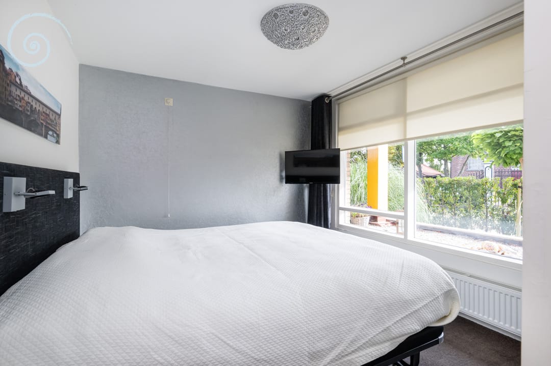 Aan de achterzijde vindt u een ruime (slaap)kamer met aansluitende 2e badkamer, ingericht met douche, wastafel en toilet.