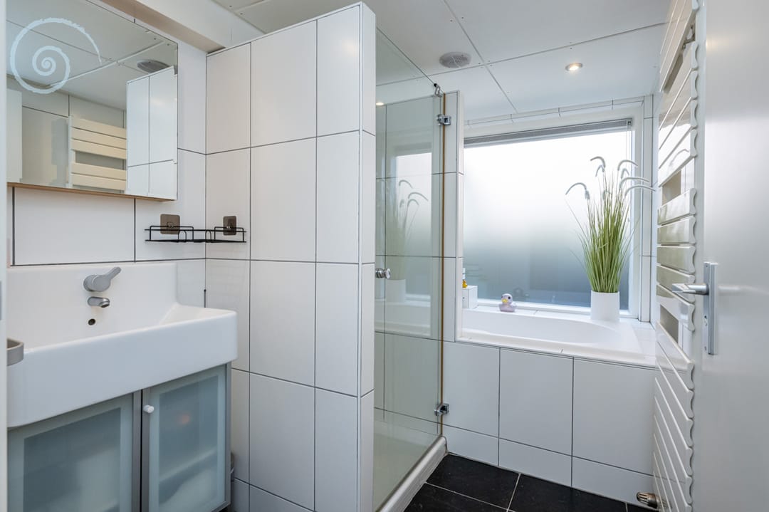 De aanwezige badkamer is betegeld en voorzien van ligbad, douche, wastafelmeubel en designradiator.