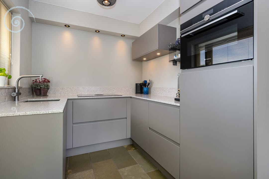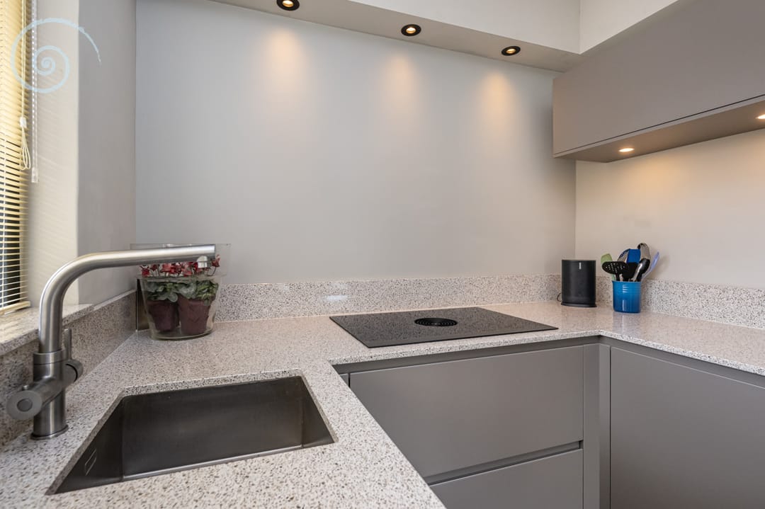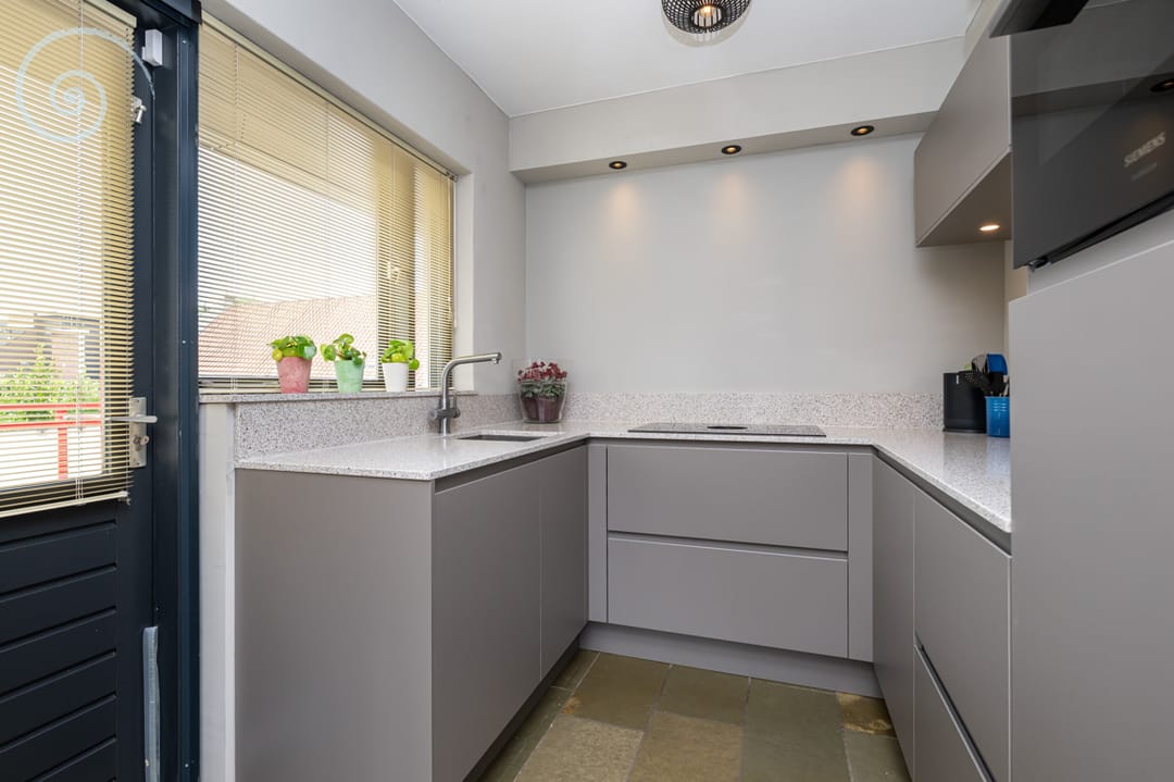 De recent vernieuwde keuken is voorzien van hoogwaardige apparatuur, waaronder een Bora inductiekookplaat met geïntegreerde afzuiging, combi oven (stoom), quooker, vaatwasmachine en koelkast. Vanuit de keuken stapt u zo het royale zonneterras op het Zuiden op.