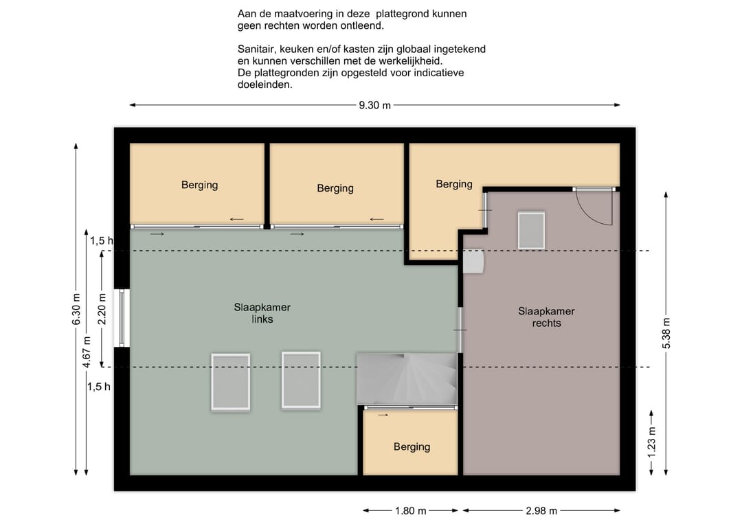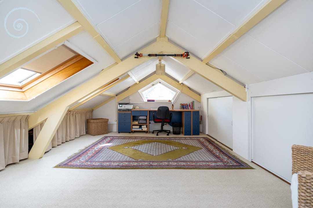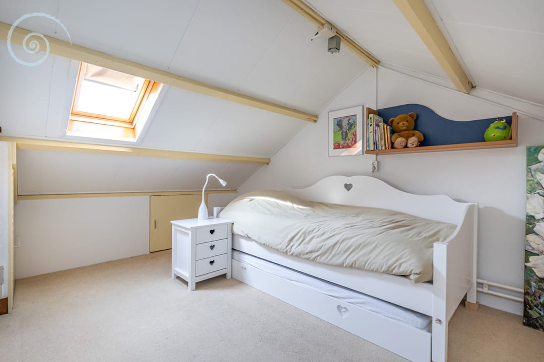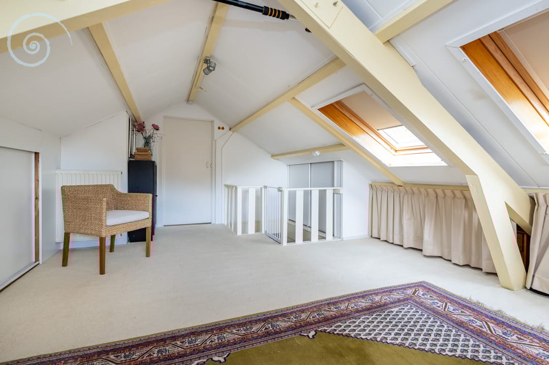 Hier treft u een open zolderkamer met dakramen en bergruimte, ideaal als hobby- of werkruimte.