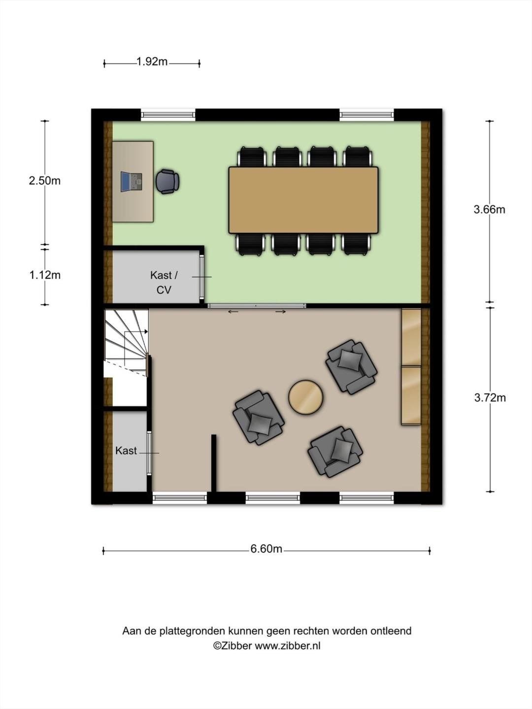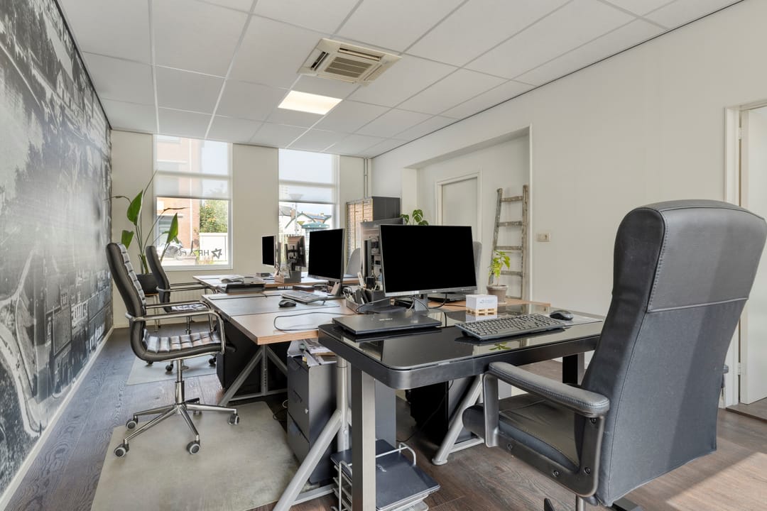De entree leidt naar een hal met toegang tot het toilet en een open trap naar de verdieping. Waar nu de kantoortuin is met 5 werkplekken, zou u eenvoudig een royale woonkamer kunnen creëren, terwijl de keuken op de begane grond al praktisch en functioneel is ingericht. Boven bevinden zich momenteel twee vergaderruimtes/werkplekken die uitstekend als slaapkamers kunnen dienen. Met het toevoegen van een badkamer, waardoor één kamer iets compacter wordt, ontstaat er een volwaardige woonverdieping.
