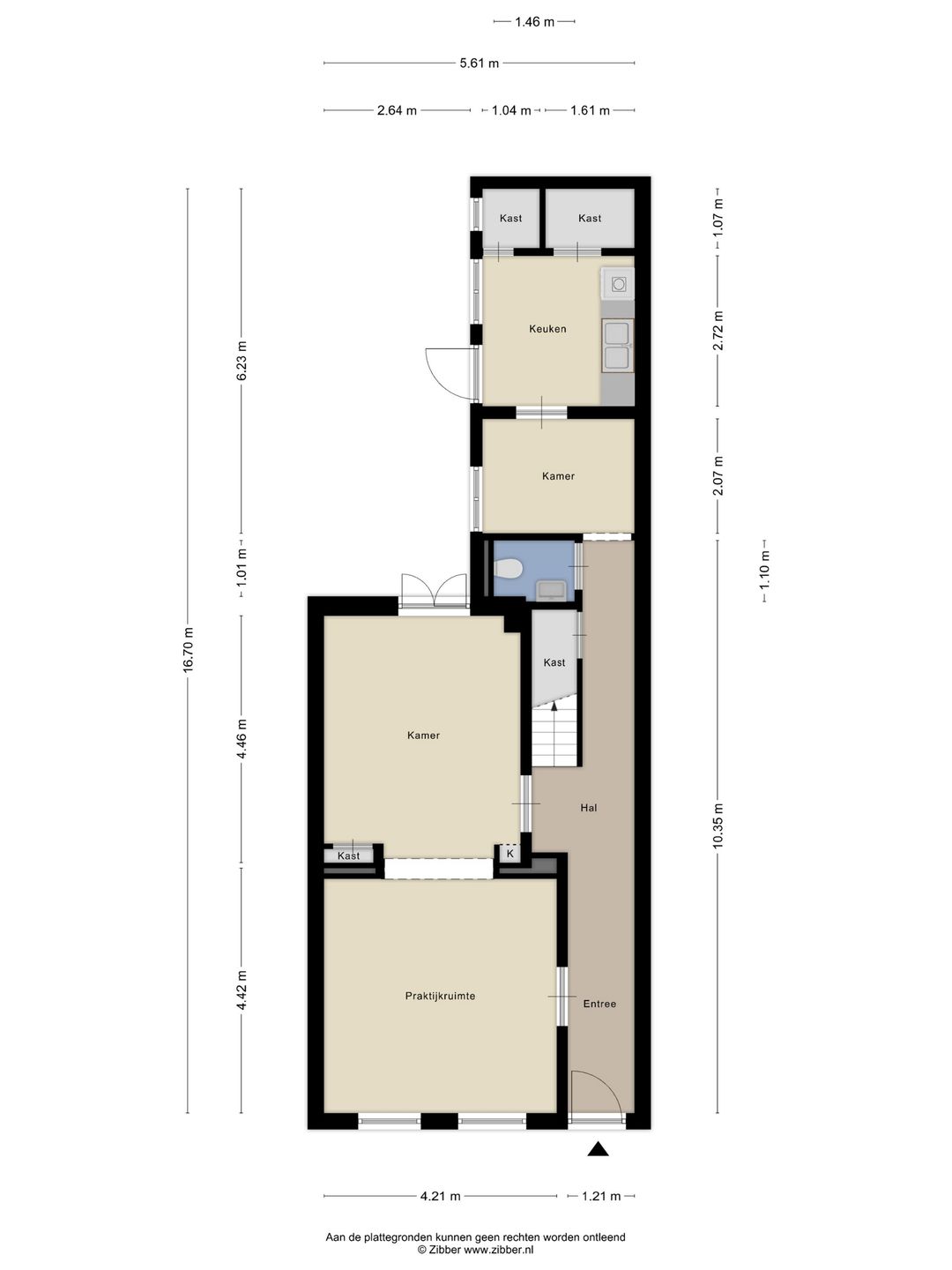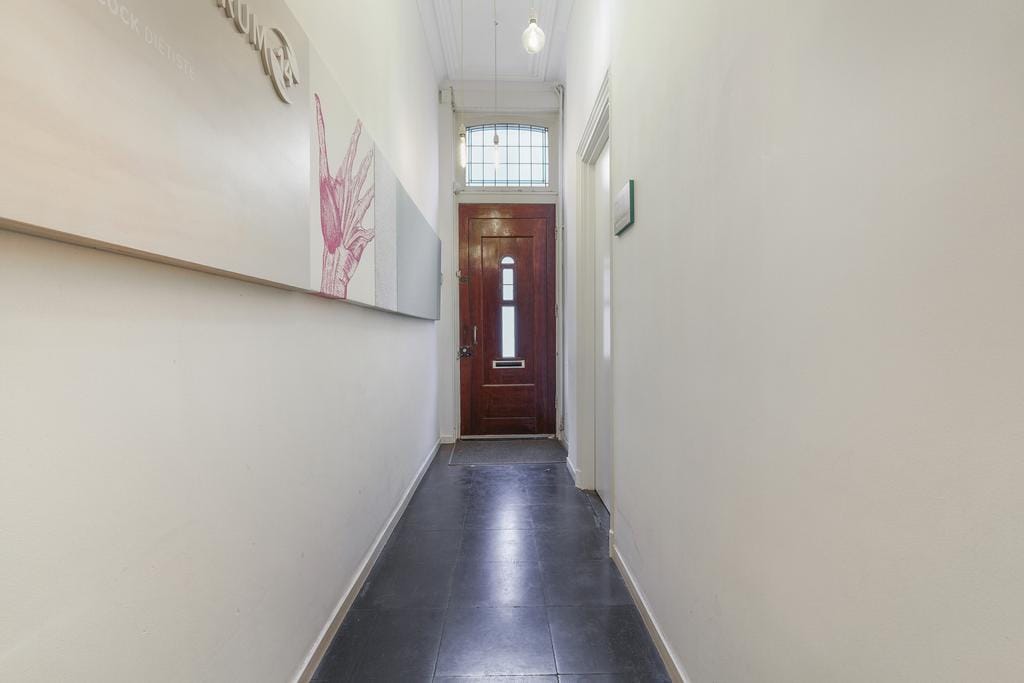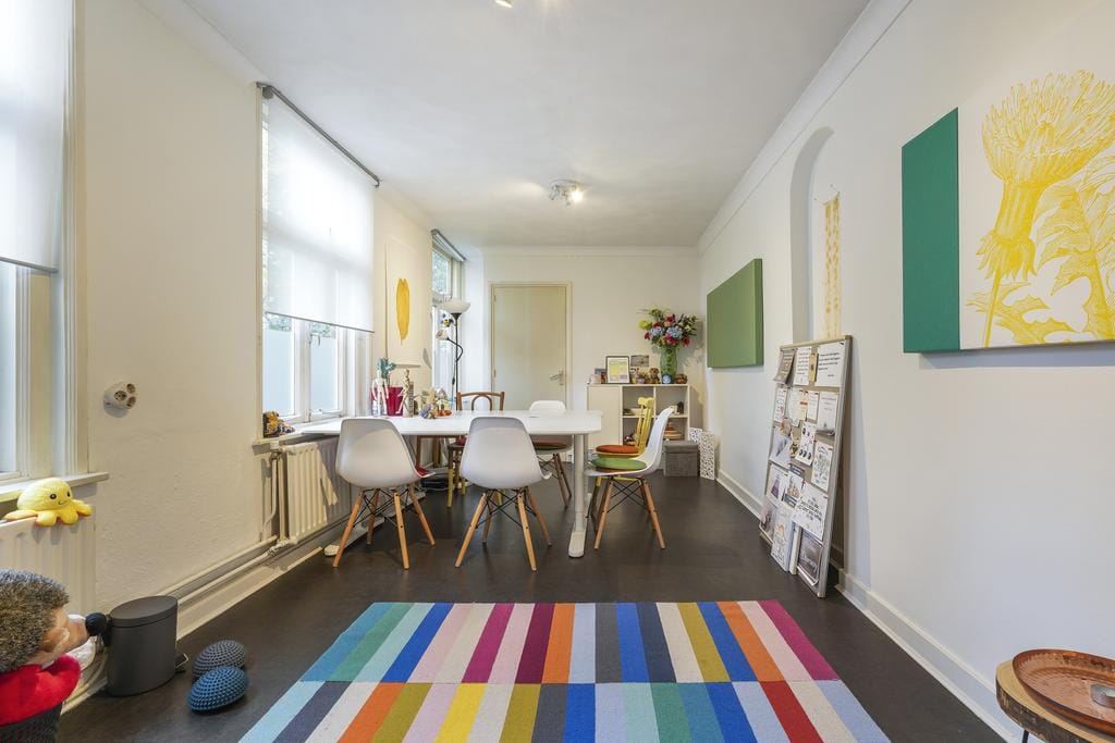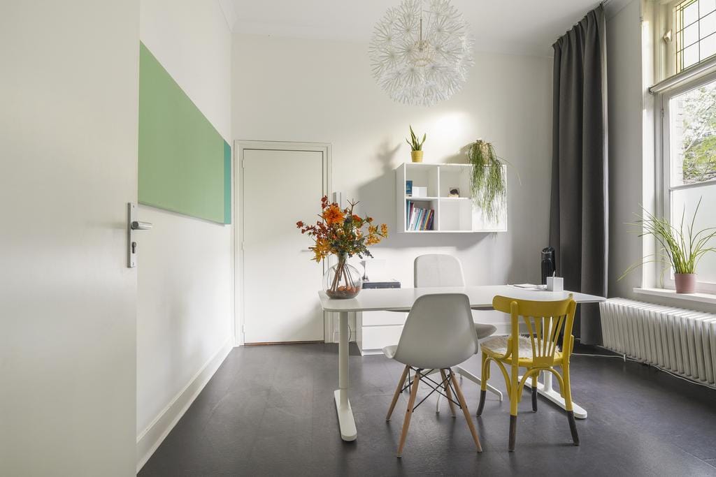 De begane grond biedt twee royale kamers: een voorkamer (ideaal als woonkamer, praktijk of kantoor aan huis), een ruime kamer met veel lichtinval aan de achterzijde met toegang tot de tuin, en een derde kamer aan de tuinzijde. Verder een separate toiletruimte, keuken met twee vaste kasten en een deur naar de tuin.