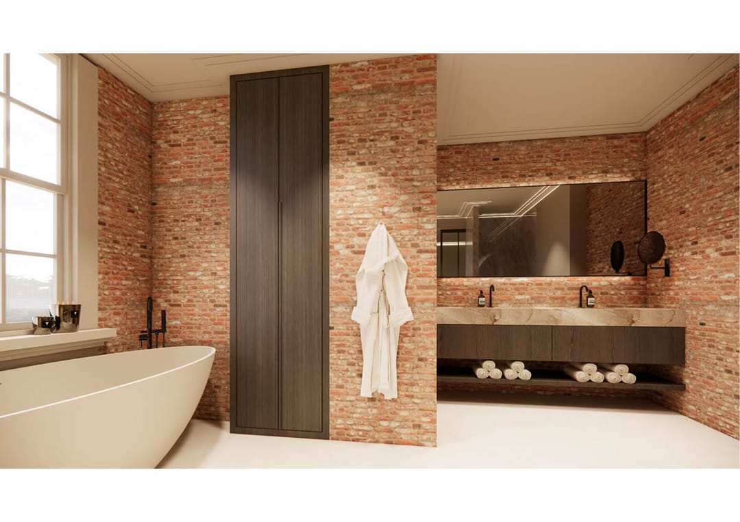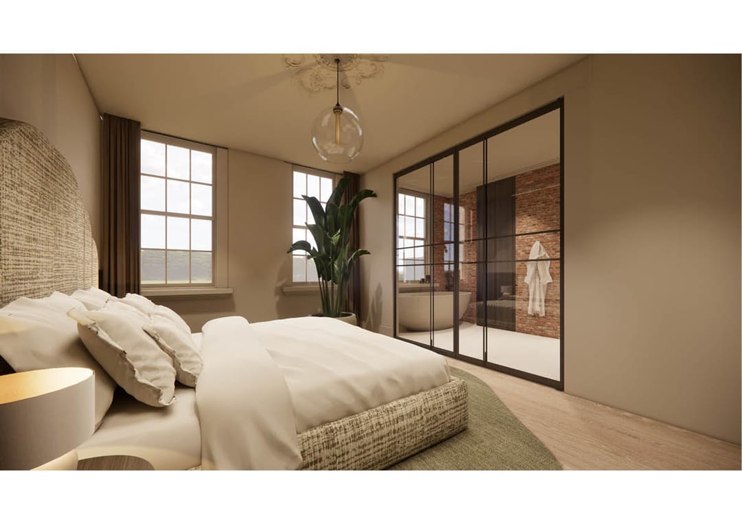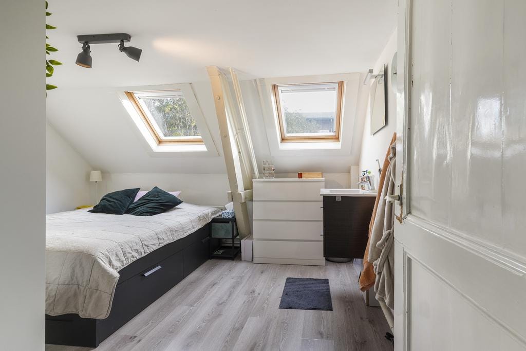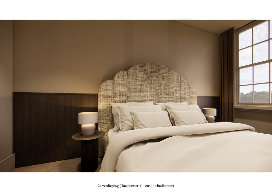 Overloop met toegang tot een aan de achterzijde gelegen royale kamer met ruime kast en wastafel, en een royale kamer aan de voorzijde. Verder bevindt zich aan de voorzijde een tweede kamer en een wastafel. De kamers aan de voorzijde zijn individueel bereikbaar en met en-suite deuren met elkaar verbonden.
