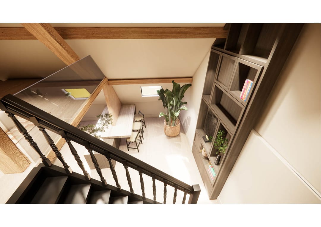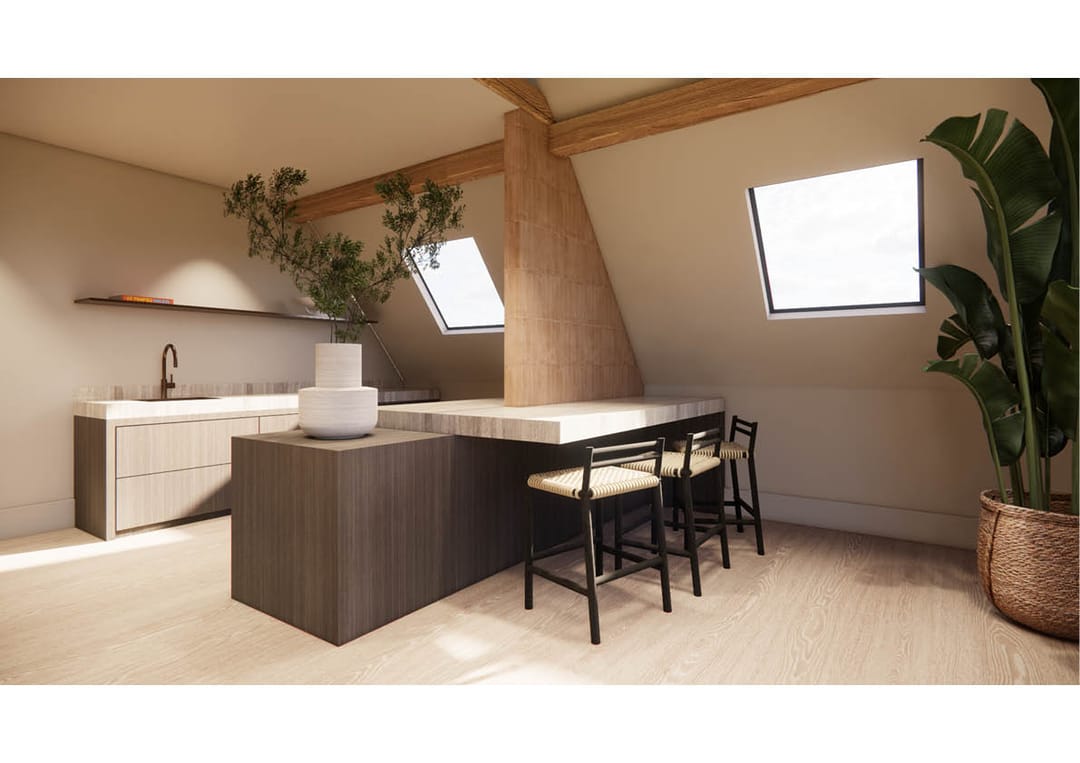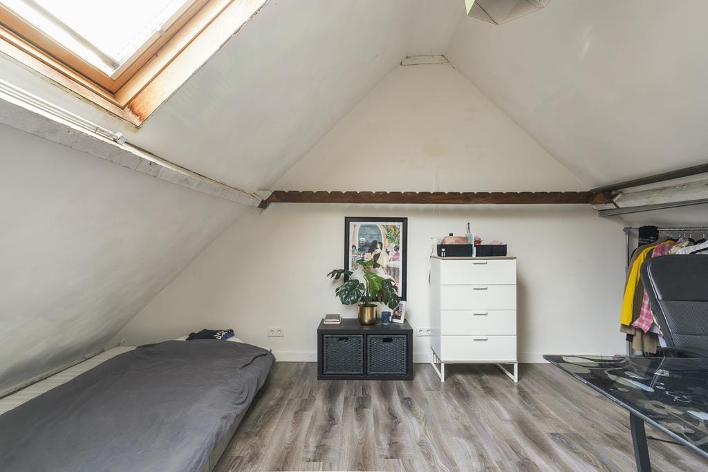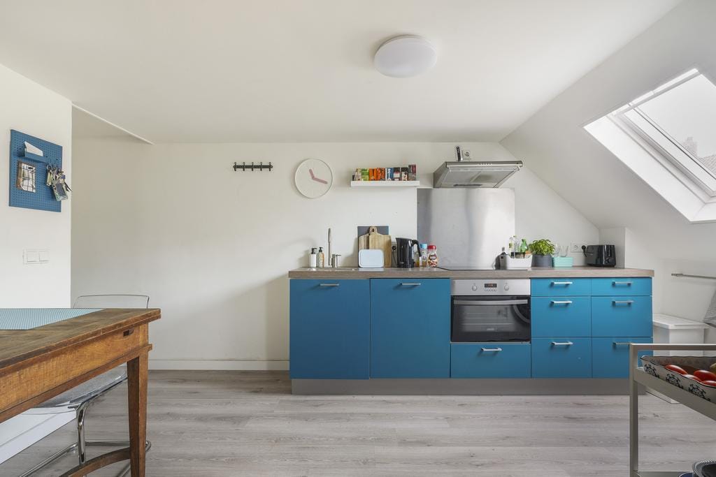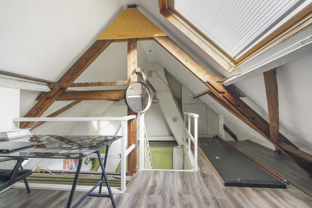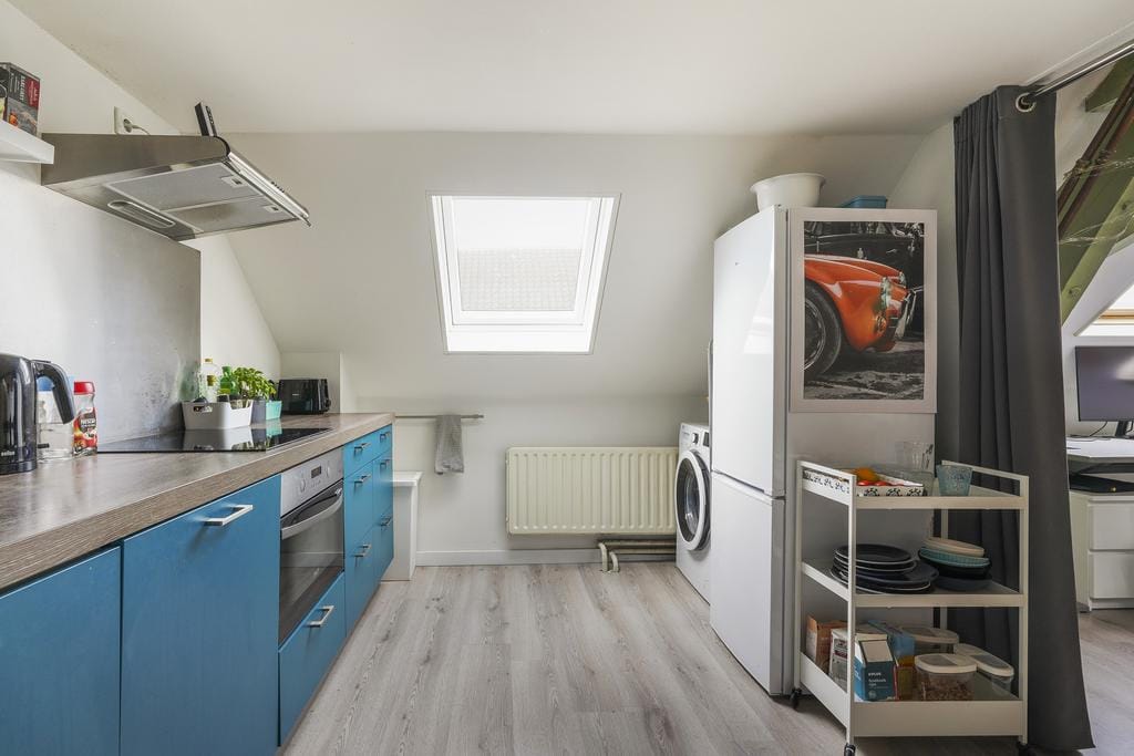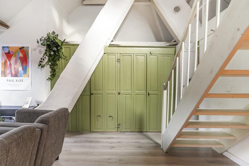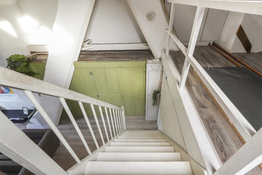 Via vaste trap bereikbaar royaal appartement met vide. Het appartement biedt een open keuken, royale woonkamer met grote bergkast, toilet, slaapkamer met douche, en via vaste trap bereikbare ruime vide.