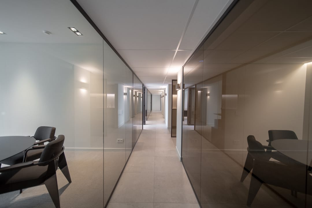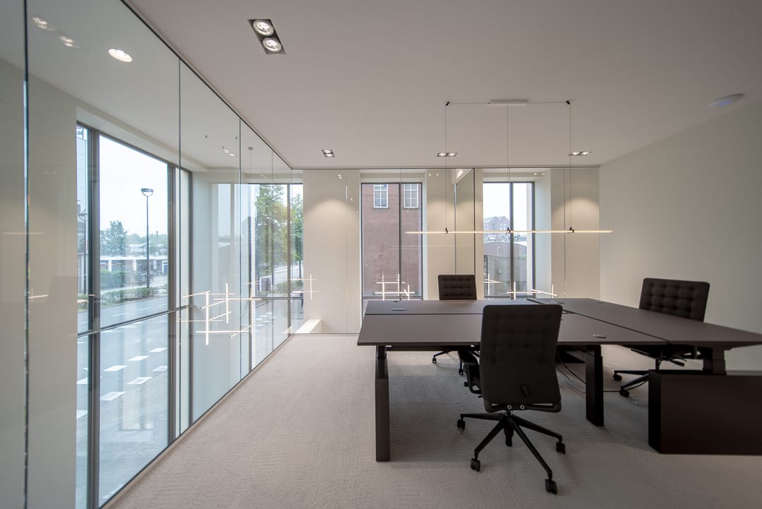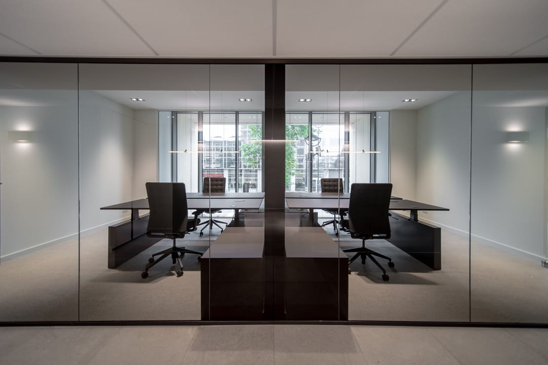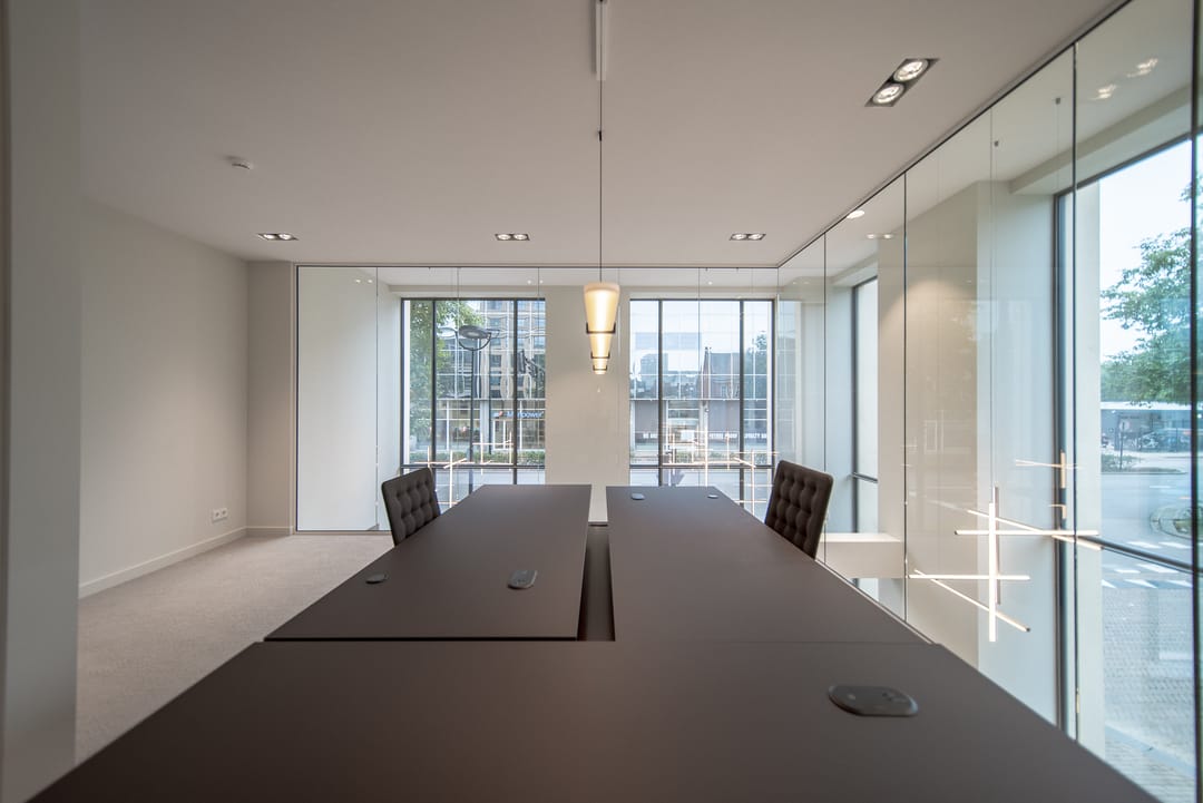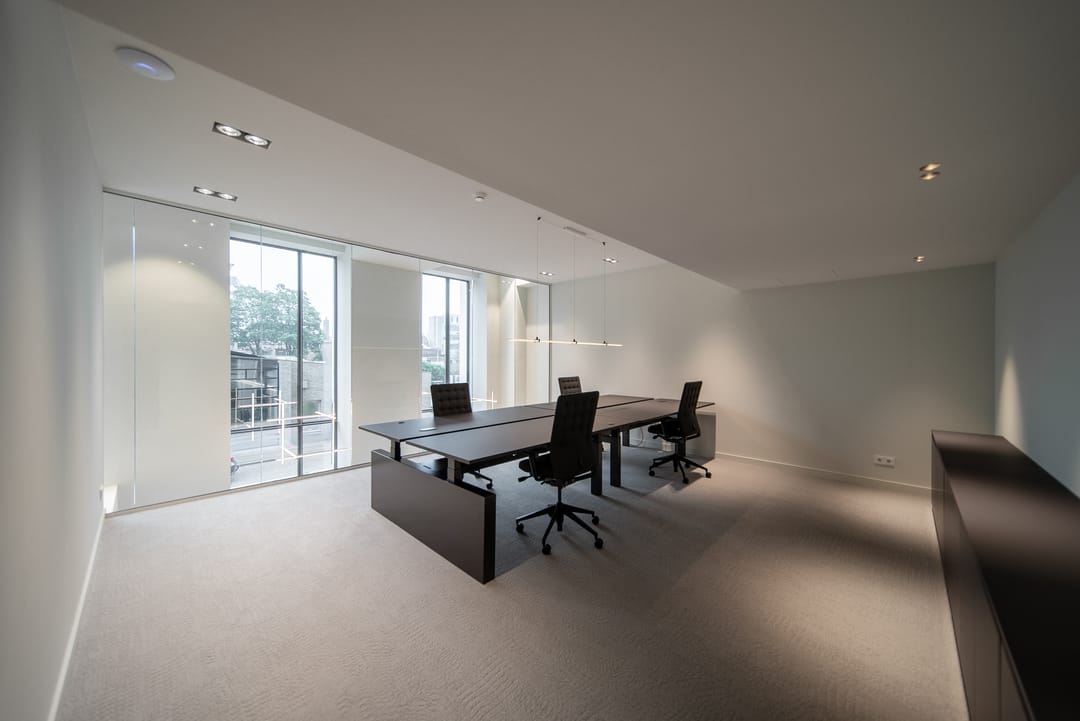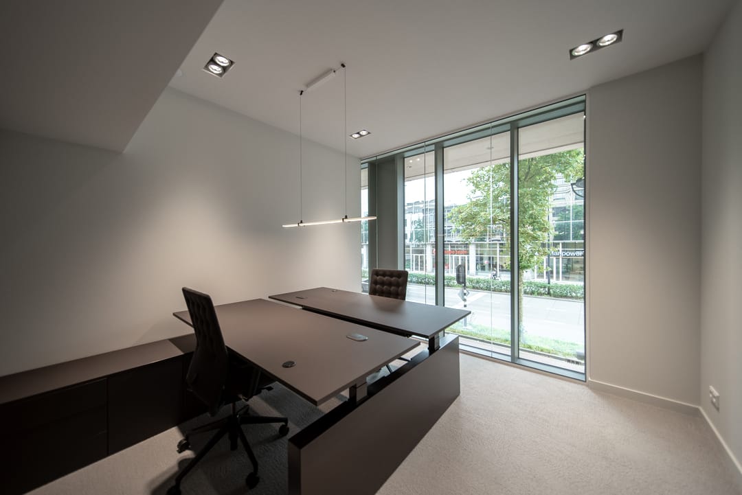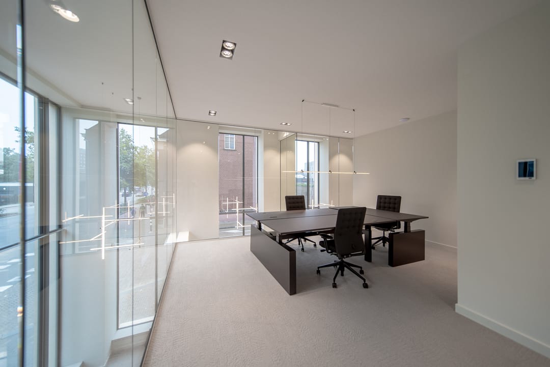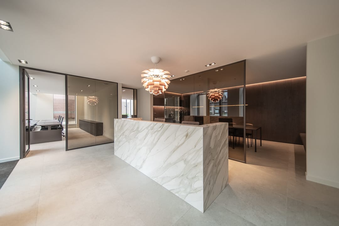 De zorgvuldig geselecteerde materialen voor de afwerking stralen warmte, rust en tijdloze klasse uit. Het brons getinte glas loopt door in alle kantoorruimten, wat zorgt voor een uniforme en verfijnde uitstraling in het interieur.