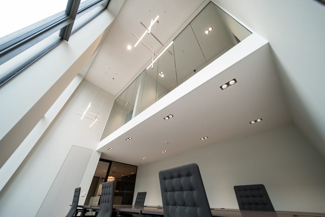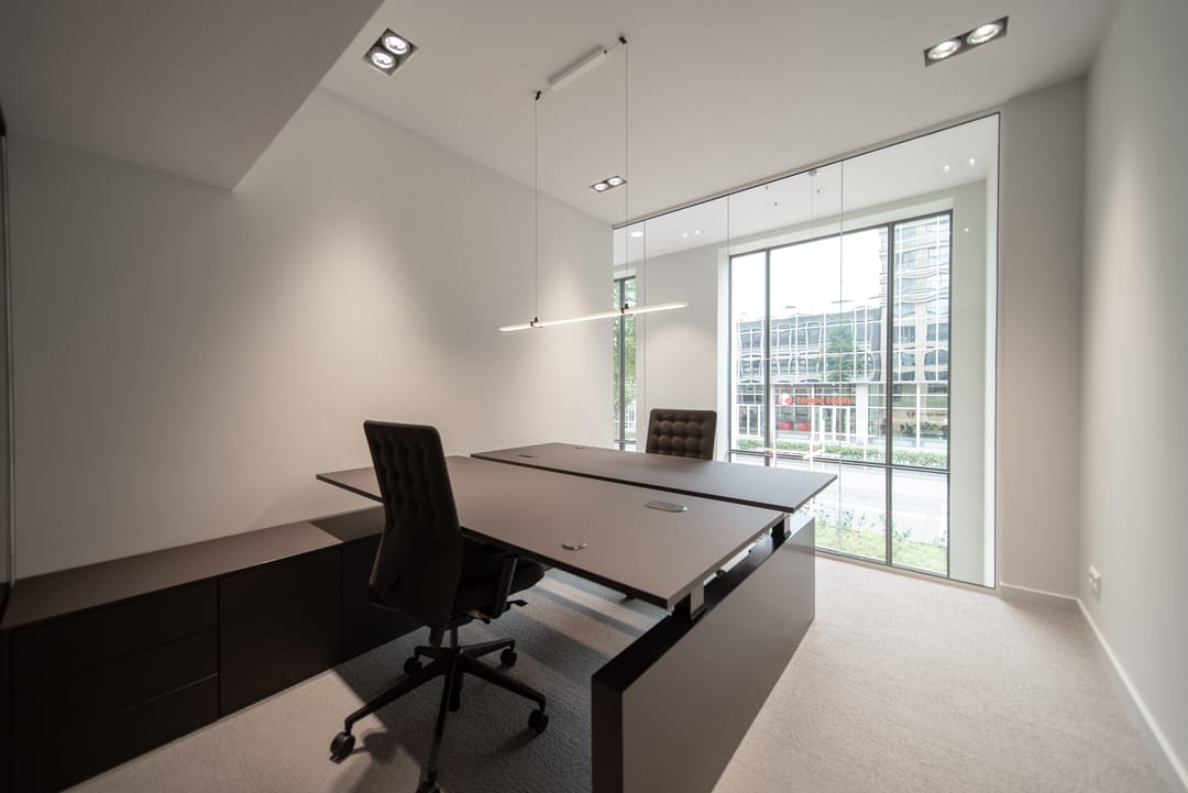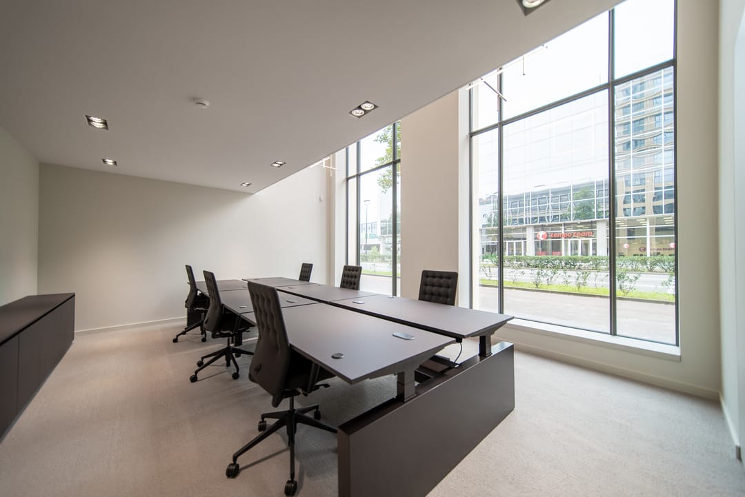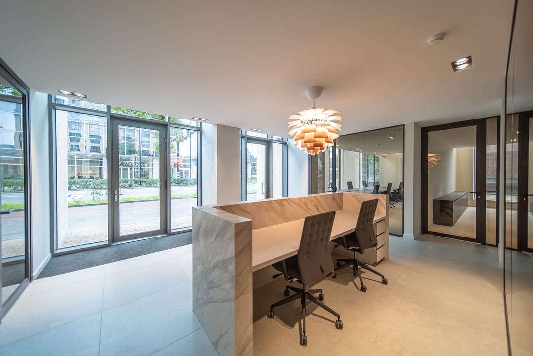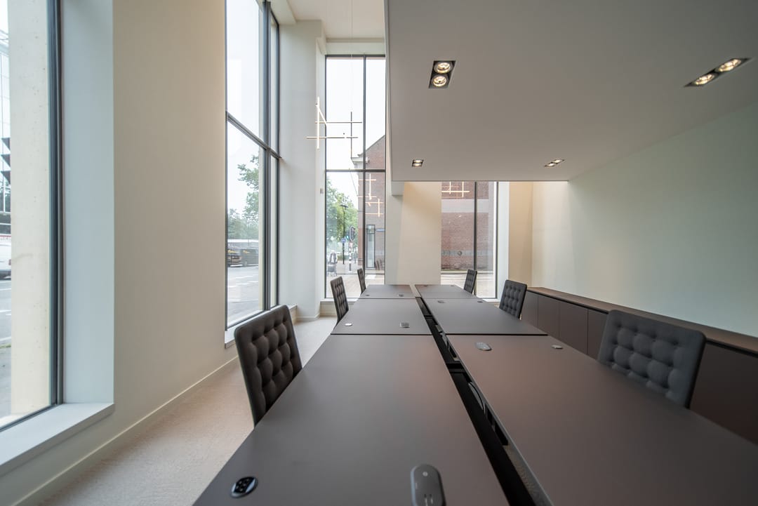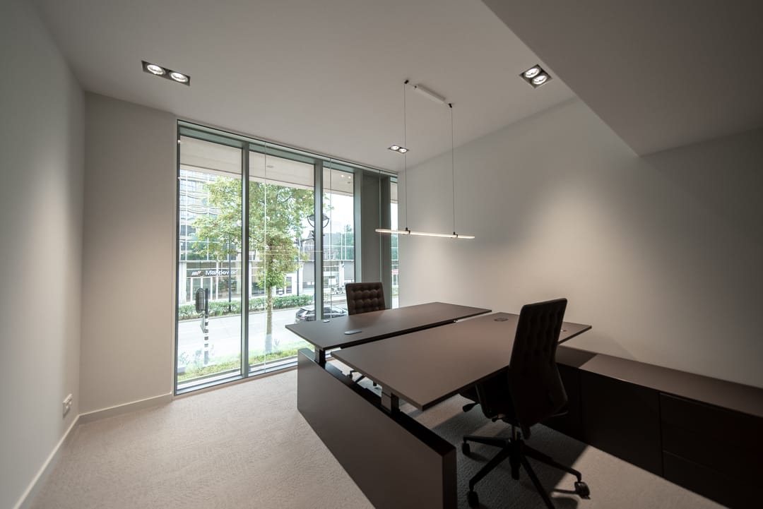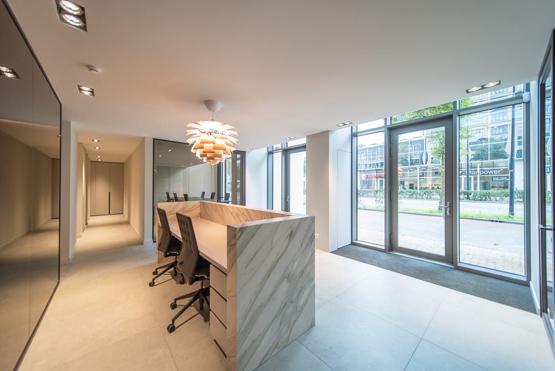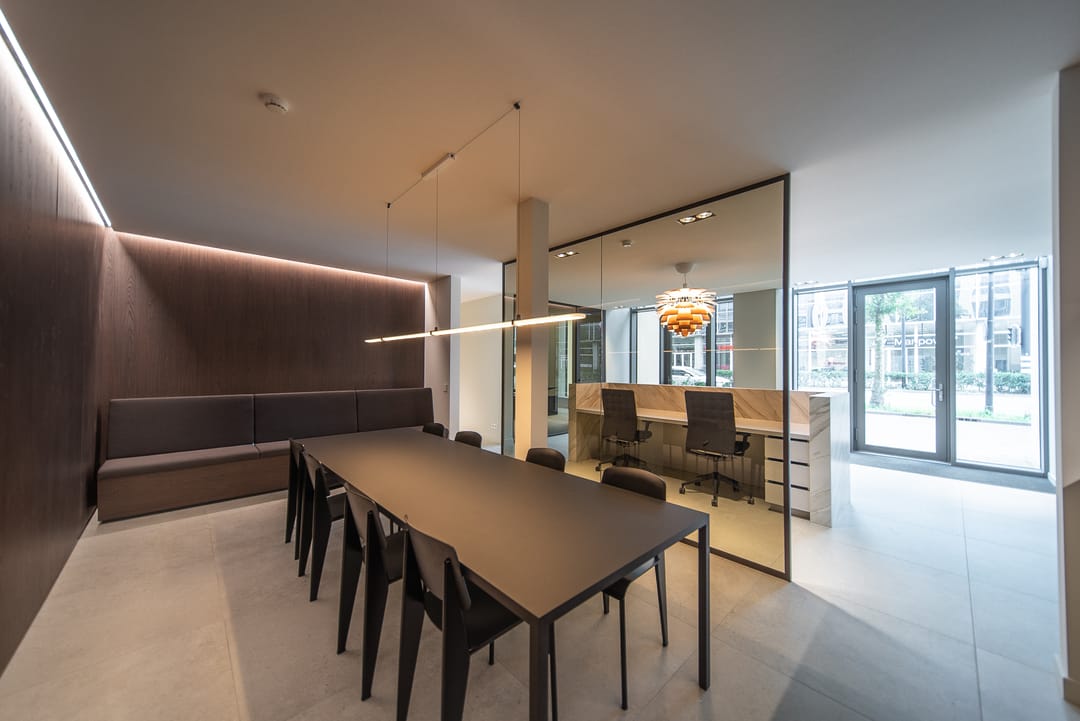 De zorgvuldig geselecteerde materialen voor de afwerking stralen warmte, rust en tijdloze klasse uit. Het brons getinte glas loopt door in alle kantoorruimten, wat zorgt voor een uniforme en verfijnde uitstraling in het interieur.