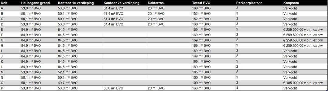 De units beschikken over diverse vloeroppervlakten en zijn al beschikbaar vanaf circa 100 m². De bedrijfspanden zijn elk voorzien van minimaal twee eigen parkeerplaatsen en worden in casco staat conform bijgevoegde technische omschrijving opgeleverd.