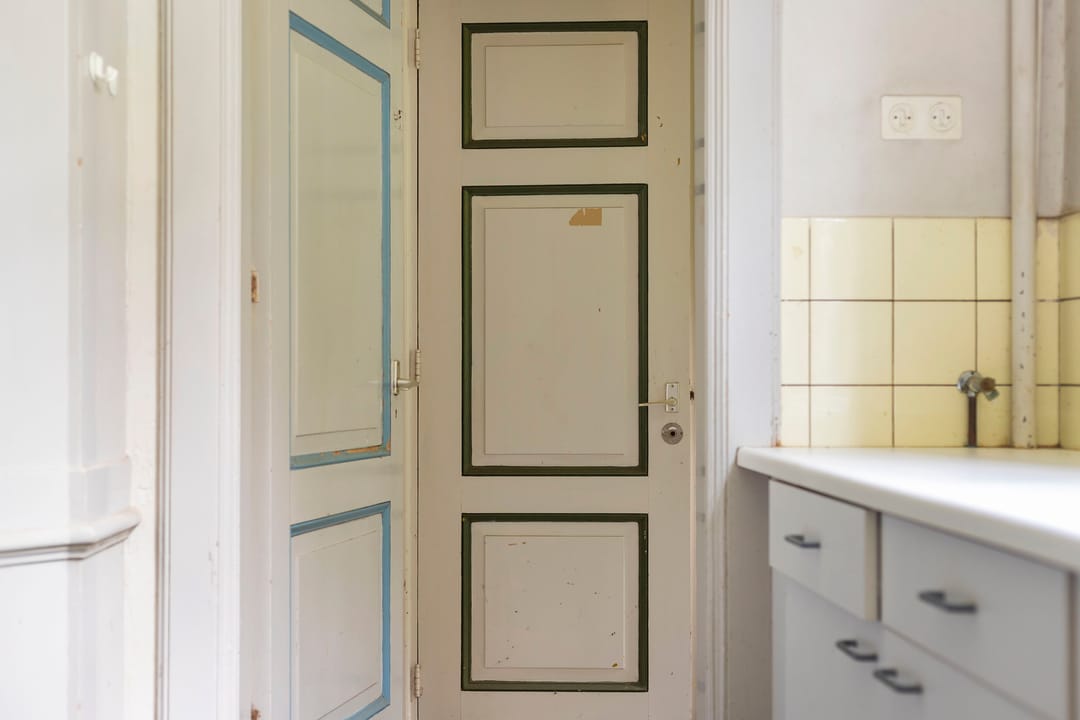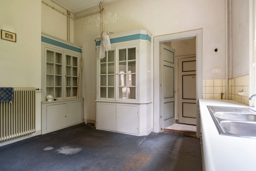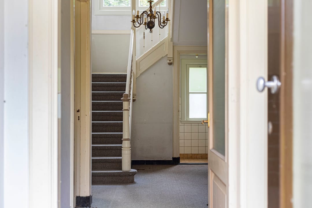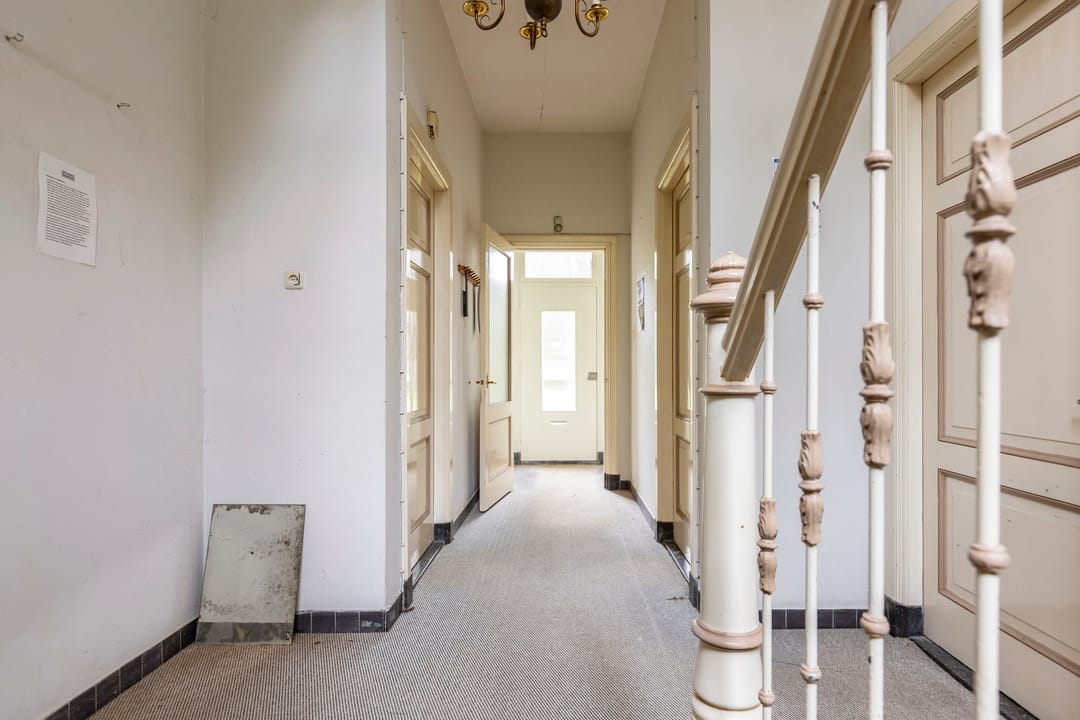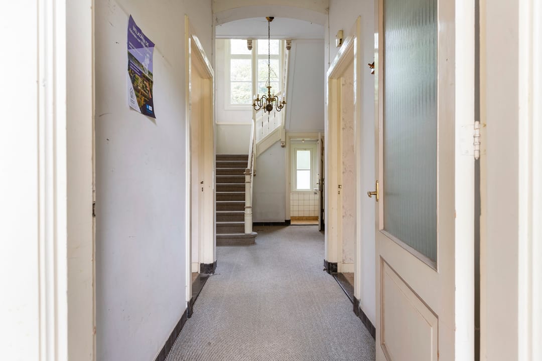 Begane grond: Via de symmetrisch ingedeelde voorgevel betreedt men de centrale hal met trappenhuis en toilet. Links van de hal ligt een salon met schouw en dubbele deuren naar de achterkamer, die op haar beurt toegang geeft tot het terras en de tuin. Rechts bevindt zich een voormalige studeerkamer, nu geschikt als werkkamer of extra zitkamer. Aan de achterzijde ligt een ruime keuken met bijkeuken en directe toegang tot buiten. De kamers op de begane grond kenmerken zich door hoge plafonds, dubbele deuren en grote raampartijen. De ruimte is flexibel in te delen, ook voor gebruik als praktijk, kantoor of atelier.
