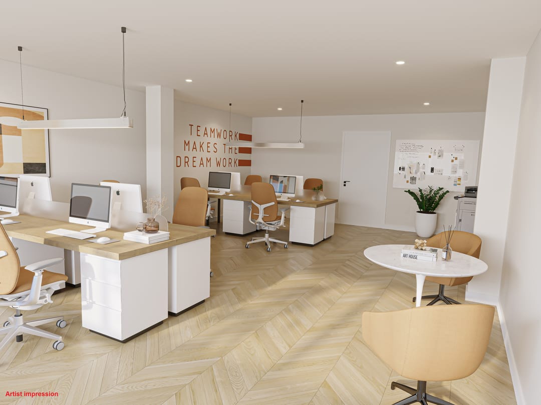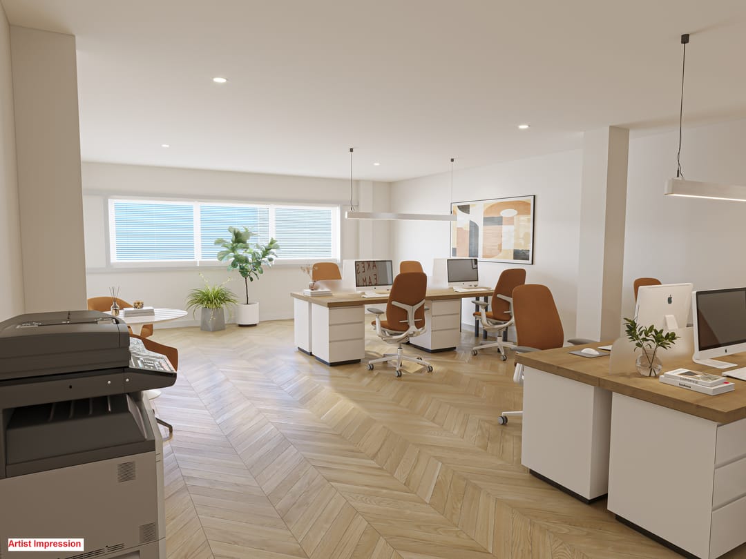 Deze kantoorruimte (unit 3) is ideaal voor een kleinschalig of 'hybride' bedrijf, dat behoefte heeft aan een fijne, overzichtelijke werkplek. De kantoorruimte zelf is ca. 52m², met grote ramen voor veel lichtinval. Inclusief het aandeel gemeenschappelijke ruimte met pantry en toiletten, betreft het ca. 63m².