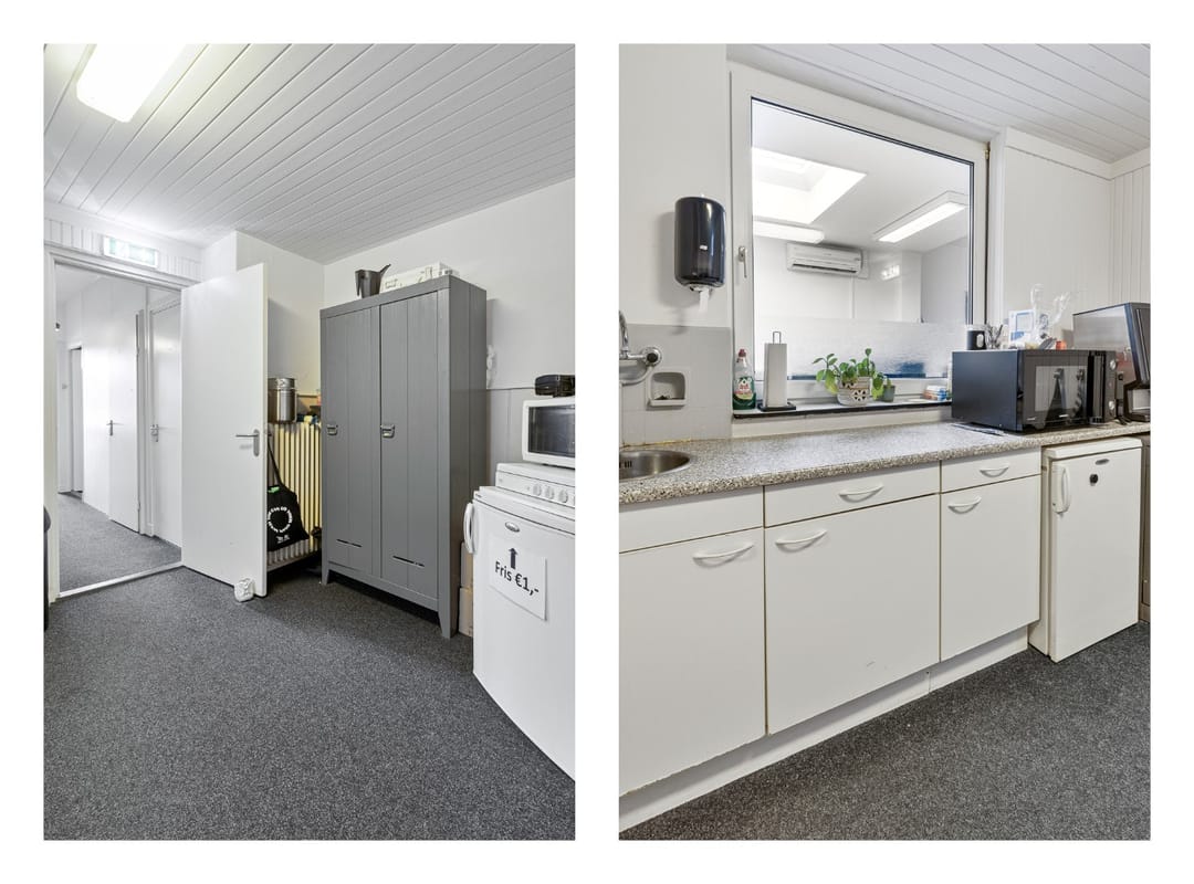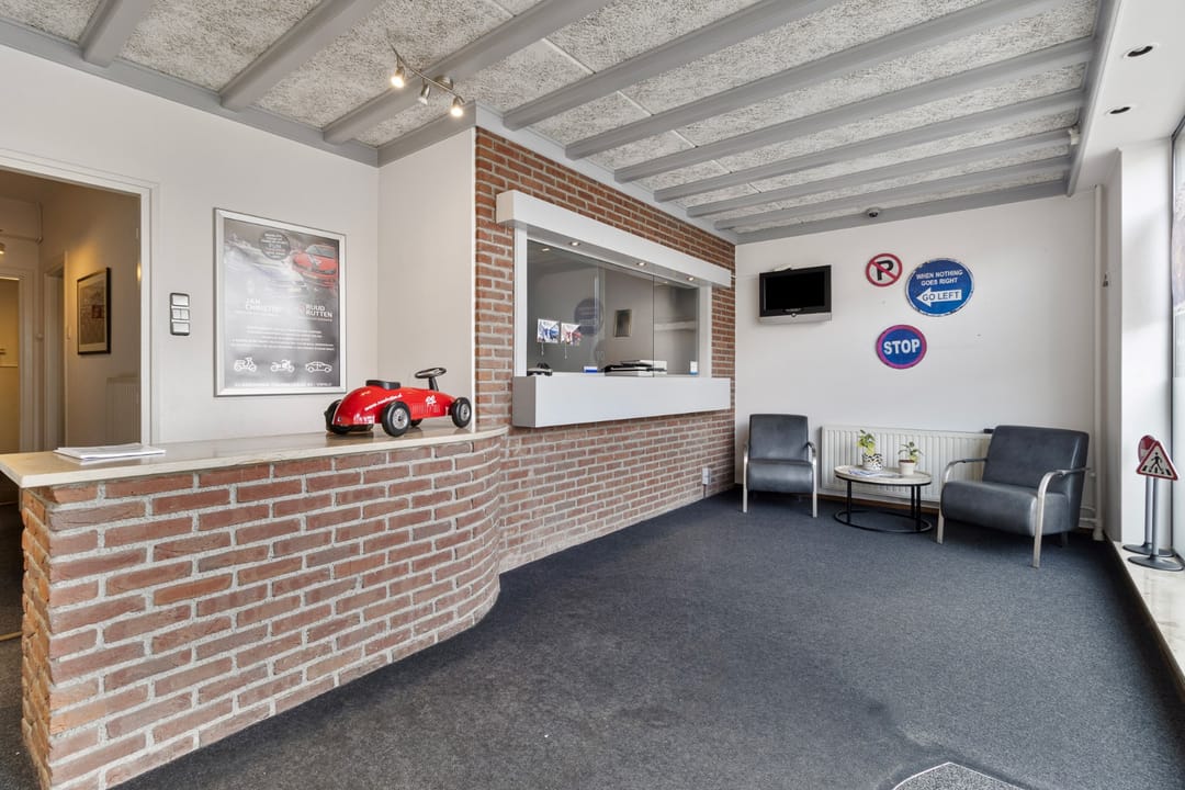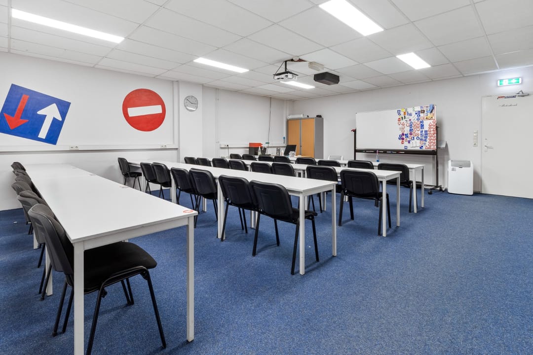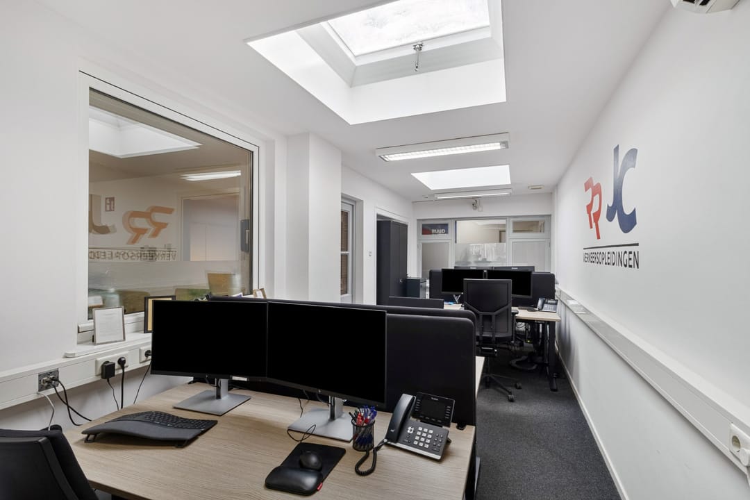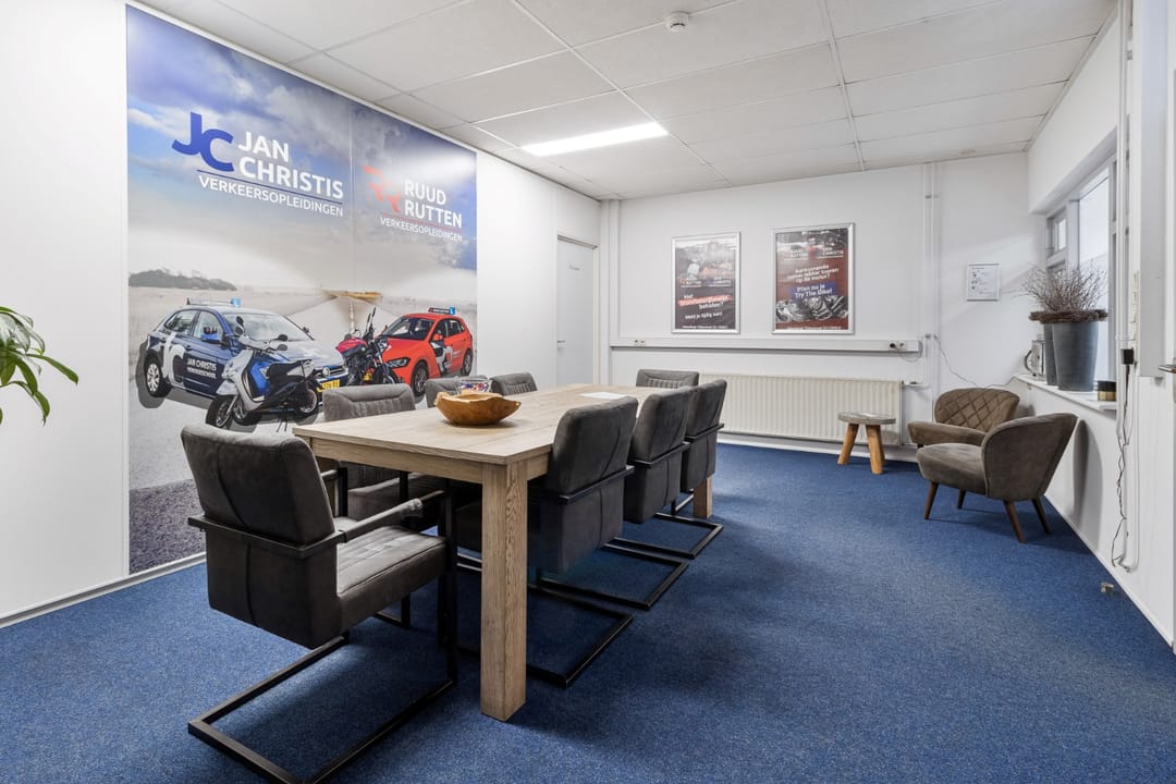 Ontvangstruimte met balie, tussenhal, toiletruimte met hangend closet, ruim kantoor met 2 lichtkoepels, keuken met keukenblok en vaste kasten, kantine (ca. 15m2) met inbouwkasten, spreekkamer (ca. 22m2), royale ruimte (ca. 52m2) welke thans is gebruik is als leslokaal, net afgewerkte en inpandig bereikbare garage (ca 66m2) met kleedruimte, toiletruimte met urinoir en fontein (kleedruimte en toiletruimte met vloerverwarming). De garage heeft verder een tegelvloer, 4 dakramen, elektrische rolpoort, een loopdeur en klein keukenblokje. Via de tussenhal bereikt je de bovenwoning.