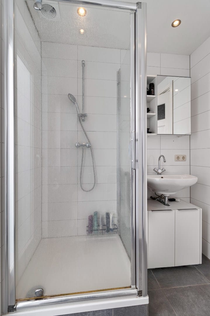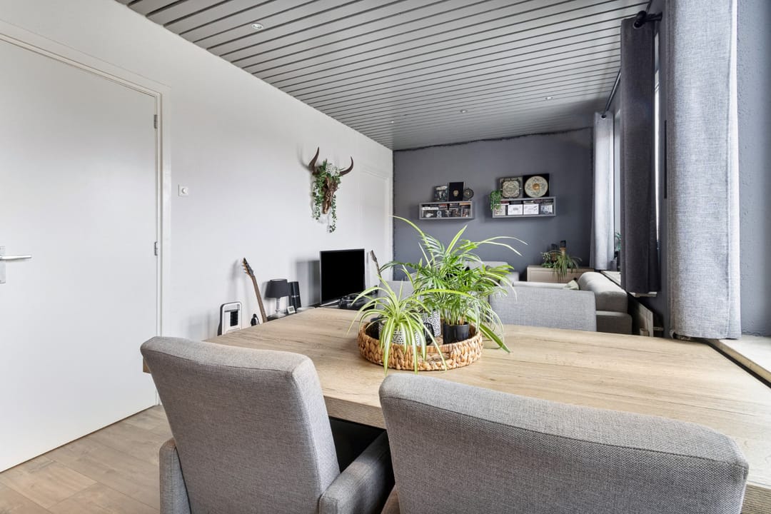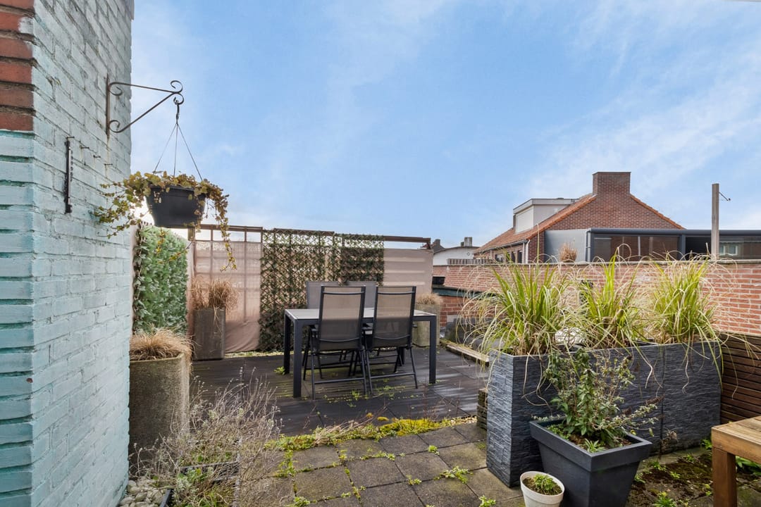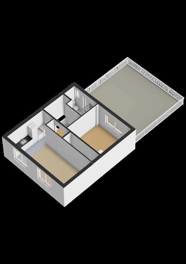 Overloop, woonkamer (ca. 21,5m2) met open keuken met keukenblok voorzien van diverse inbouwapparatuur (inductie kookplaat, oven, koelkast en afzuigkap), slaapkamer (ca. 14m2), badkamer met douche, toilet en wastafel. Via de badkamer bereik je een royaal dakterras (ca. 42m2). Deze verdieping heeft overal laminaat.