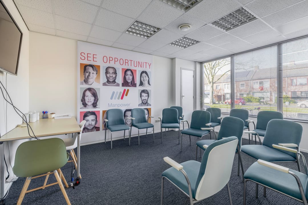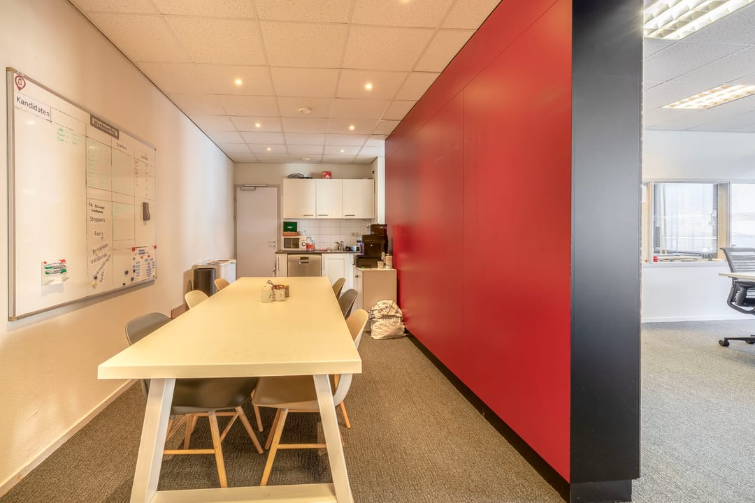 Fraaie entree met spreekkamer afgescheiden d.m.v. een glaswand, vergaderruimte, kantoortuin, afgescheiden kantine met koffiecorner en toiletten, kopieerruimte, 2 kantoorruimtes annex spreekkamers.