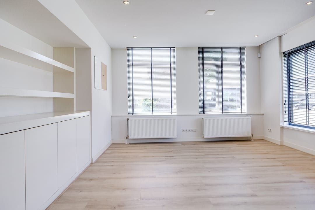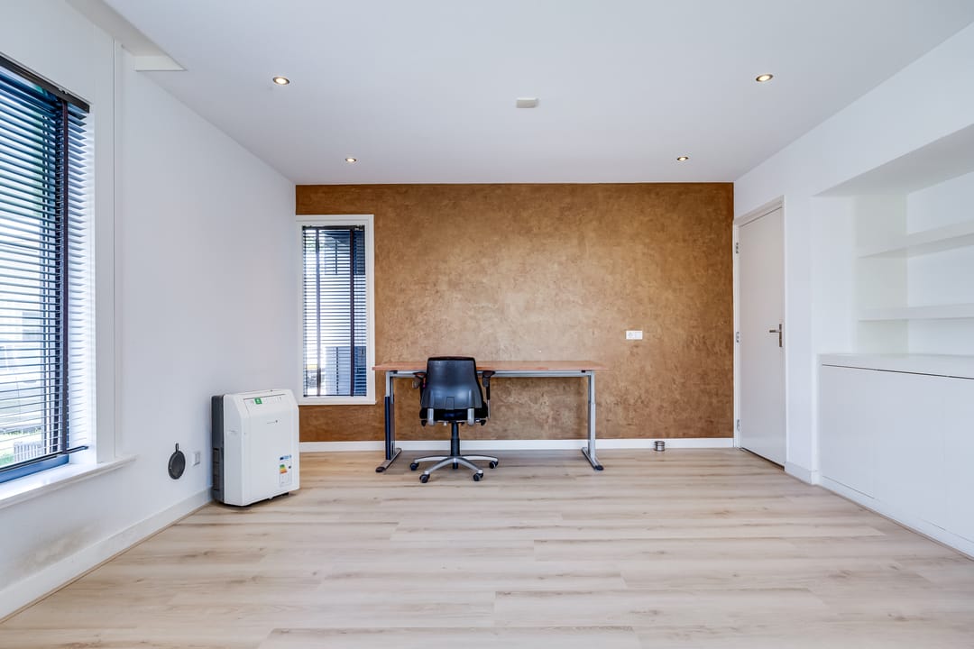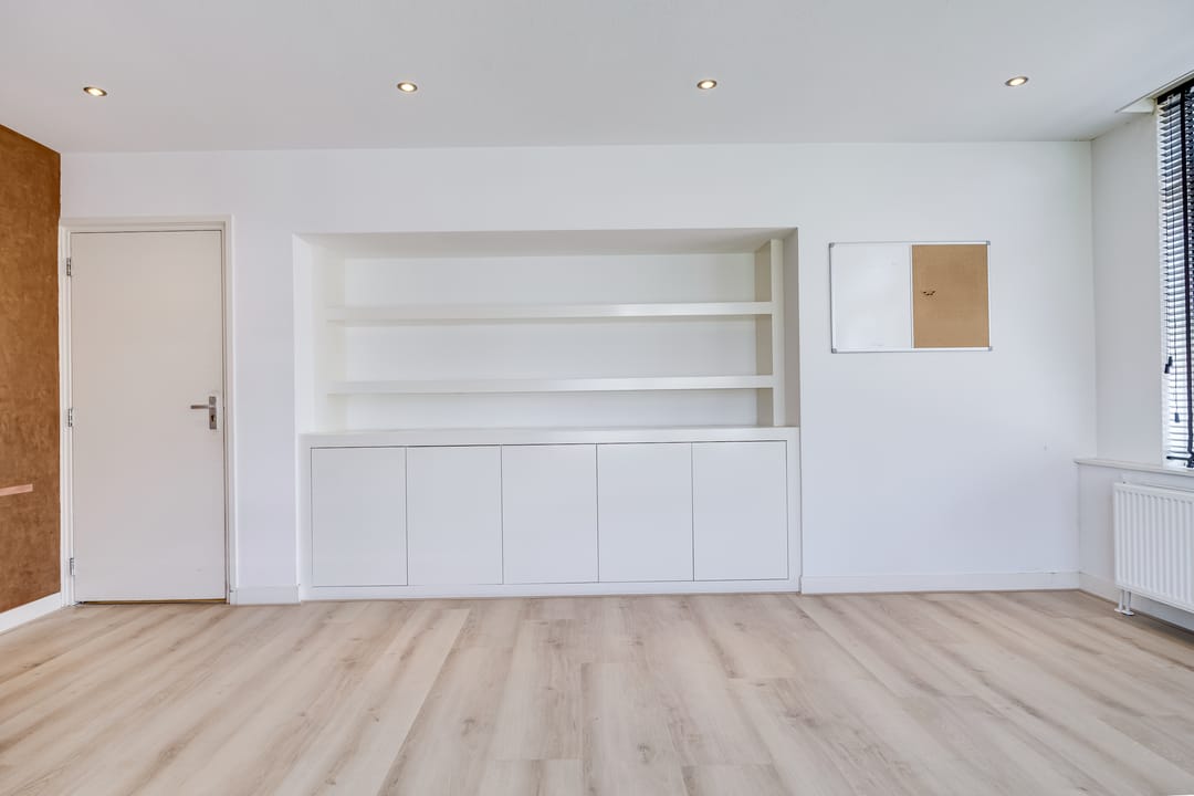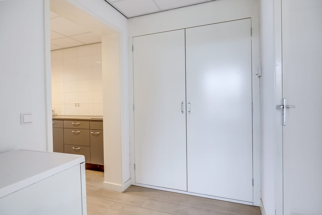 Een van de ruimte is voorzien van inbouwkasten en open legplanken. Dit alles wit en strak afgewerkt. Een kleinere kantoorruimte is uitstekend te gebruiken als meetingroom.