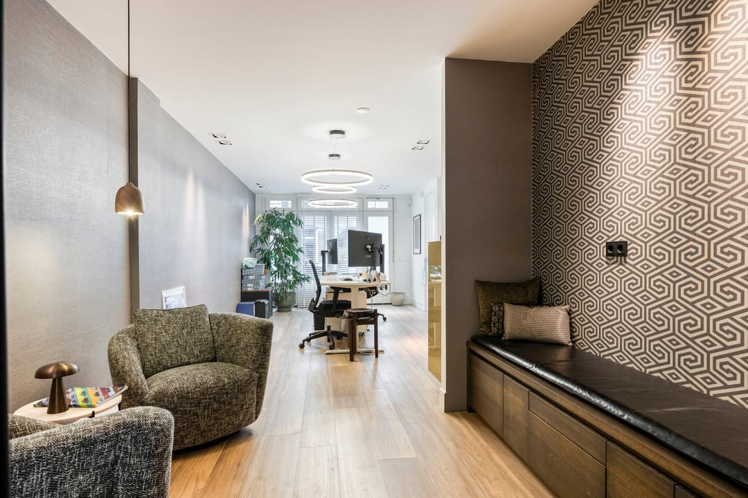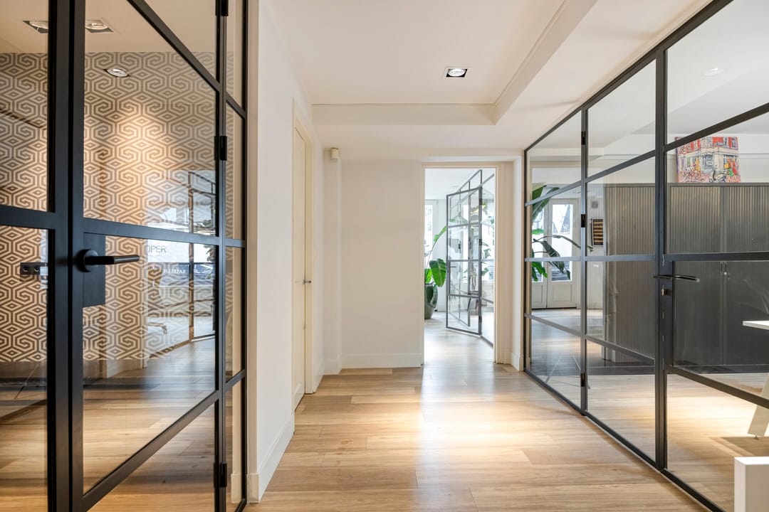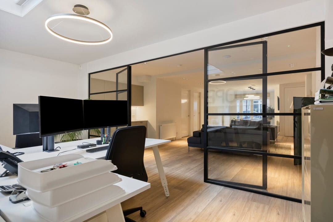 Bij binnenkomst valt direct op dat het pand beschikt over maar liefst drie eigen entrees: Tolstraat 130, 132 en 134. Deze opzet zorgt voor flexibiliteit en geeft mogelijkheden voor verschillende gebruikers of gescheiden afdelingen binnen één bedrijf. De interne indeling bestaat uit zeven afzonderlijke ruimtes die door stalen puien met glas worden gescheiden, waardoor er zowel privacy als licht en transparantie wordt gecreëerd. Centraal in het pand bevindt zich een royale vergaderzaal, ideaal voor presentaties en klantontvangst. De keuken is recent geïnstalleerd en voorzien van inbouwapparatuur. Verspreid over het kantoor bevinden zich drie toiletten. Dankzij de dakramen aan de achterzijde valt er extra daglicht binnen, wat zorgt voor een prettige werkomgeving.