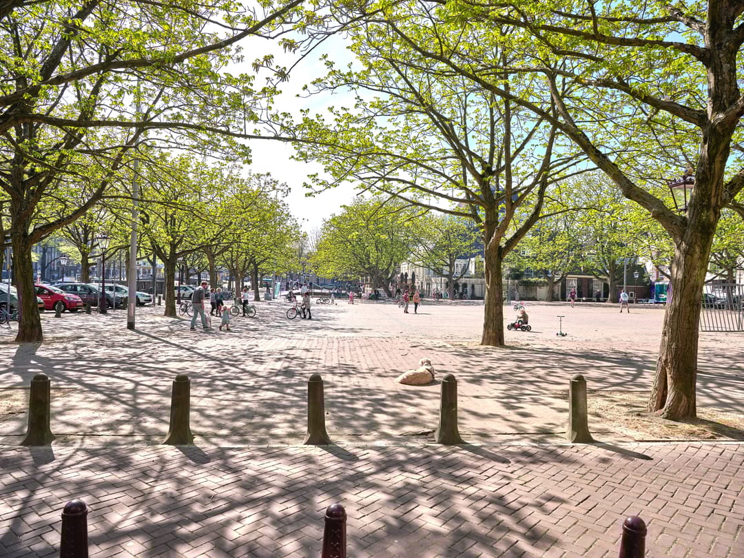 's Maandags is er bloemenmarkt. Er worden ook antiekmarkten gehouden. Er is een café met terras, een kinderspeelplaats met zandbak, een jeu-de-boulesbaan en ruimte om te voetballen. Een klein beeld van de Amsterdamse volksfiguur Kokadorus staat langs het plein. (Bron: Wikipedia).