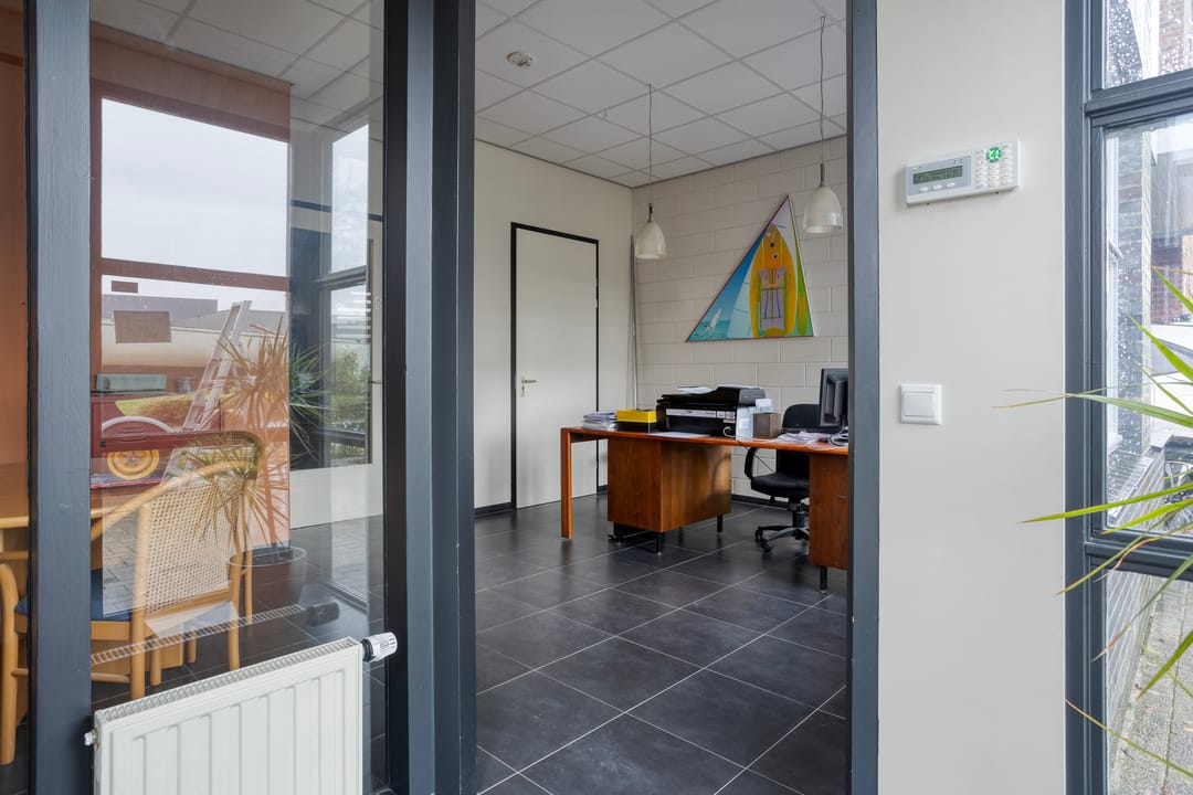 De kantoorruimte bevindt zich aan de voorzijde en is verdeeld over de begane grond en de eerste etage.