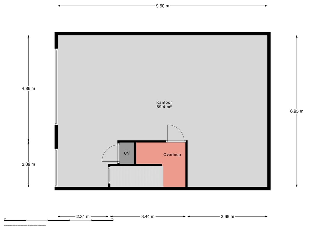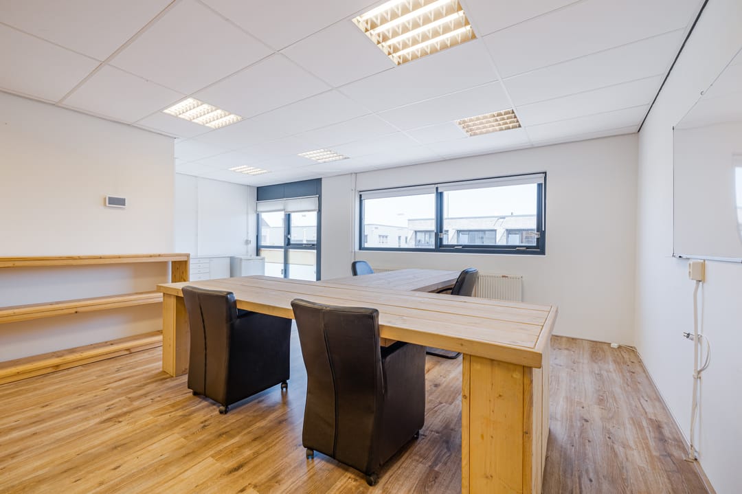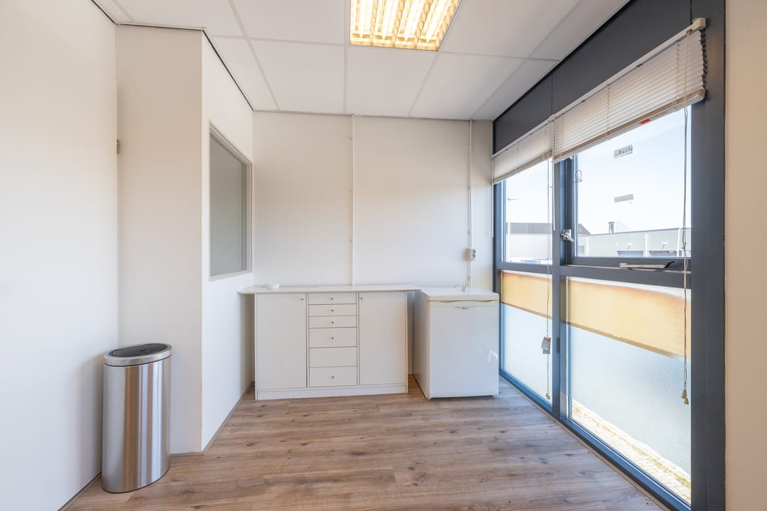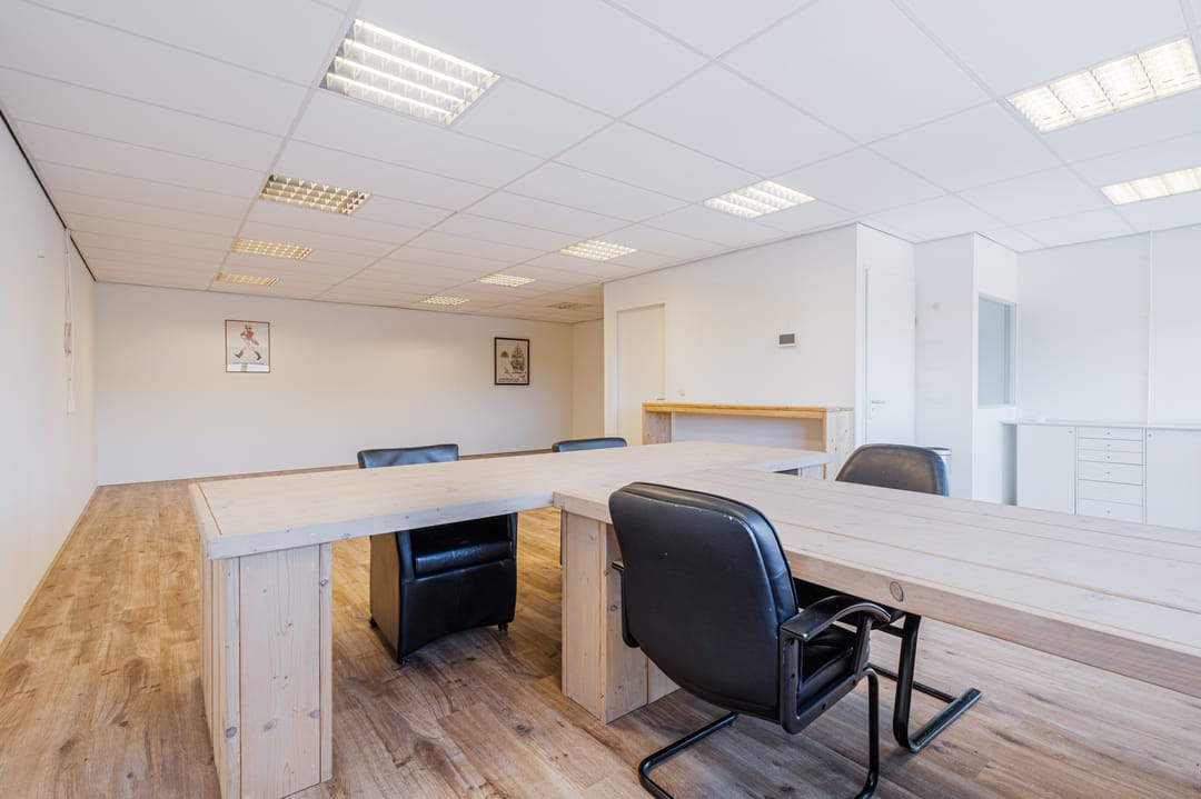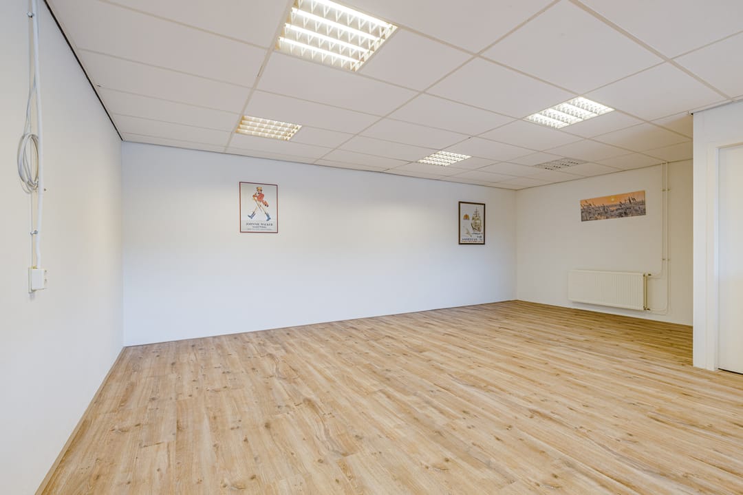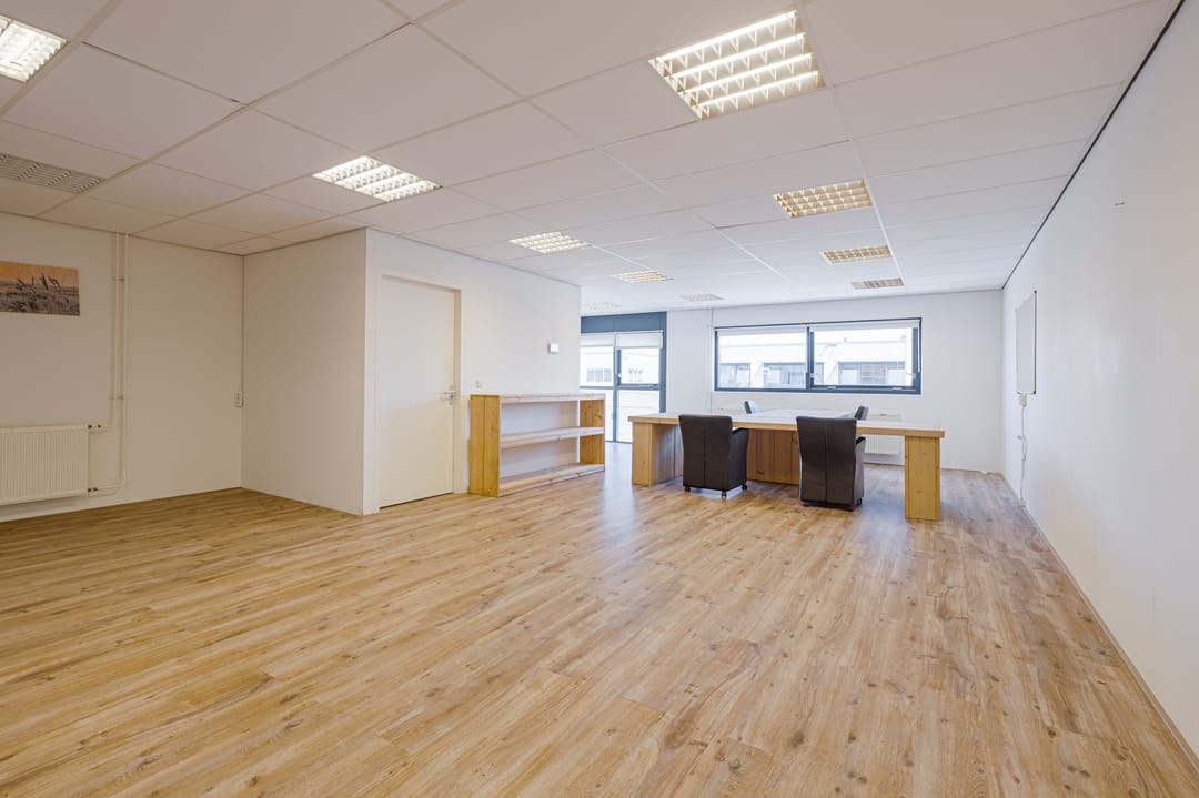 Overloop met toegang tot de kantoorruimte van ca. 59m2. Grote raampartij aan de voorzijde van het kantoor met te openen ramen. De ruimte is voorzien van diverse elektra punten en kan worden verwarmd middels radiatoren.