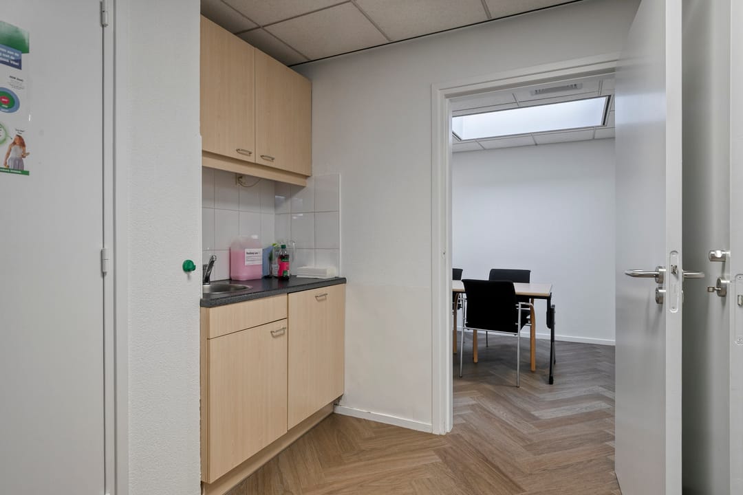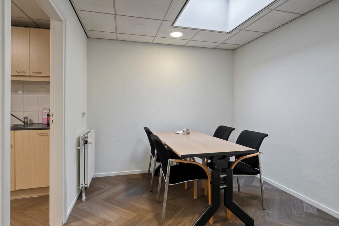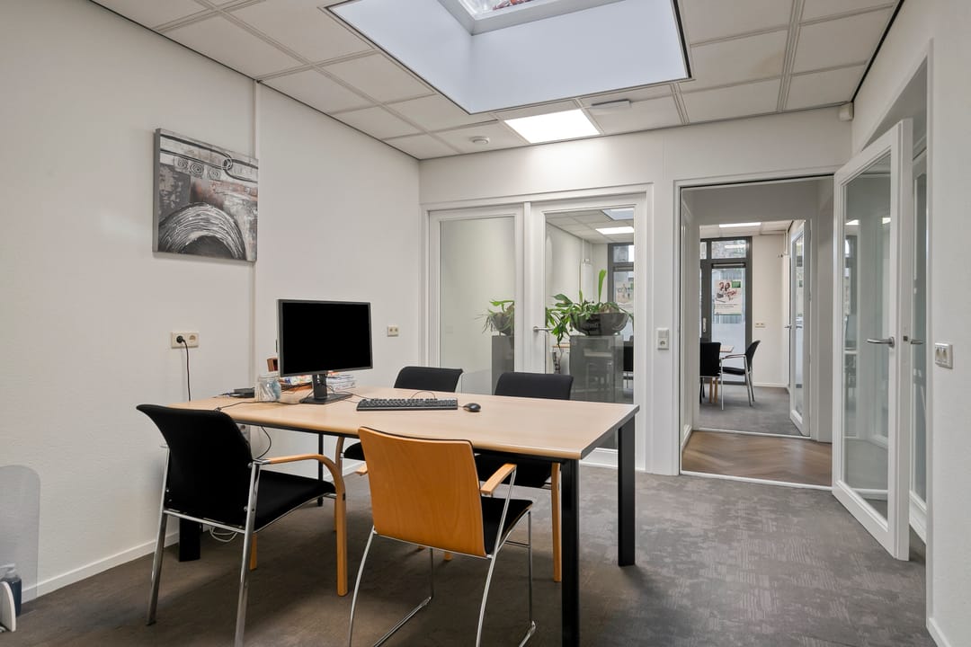 Centrale entree met een tochtportaal en de aanwezigheid van een toiletruimte, doorgang naar een kantoorruimte met baliefunctie, twee spreekkamers en een tweede toiletruimte. Aan de voorzijde is een afsluitbaar kantoor aanwezig en nog twee kleinere kantoorruimte aan de linkerzijde. Daarnaast is er een afsluitbare ruimte aanwezig met een pantry.