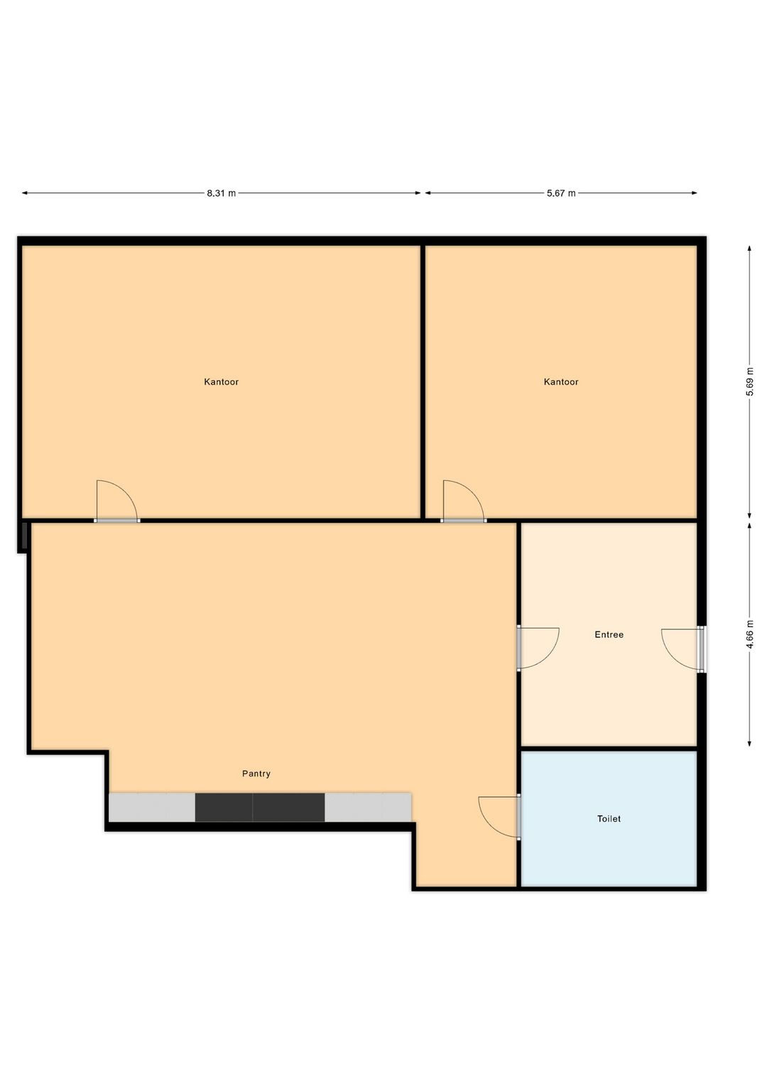 Entree naar de hal, vanaf hier geeft de ruime kantoorruimte met pantry toegang tot de twee andere kantoorruimtes en de sanitaire voorzieningen.