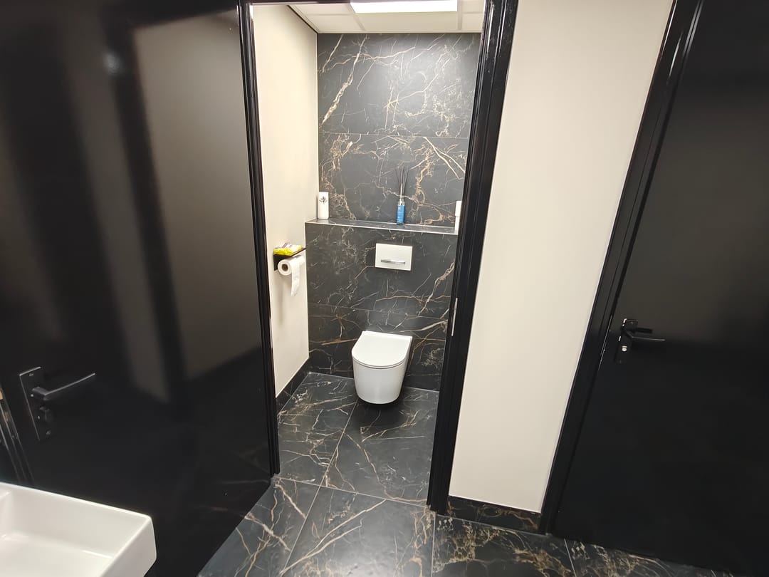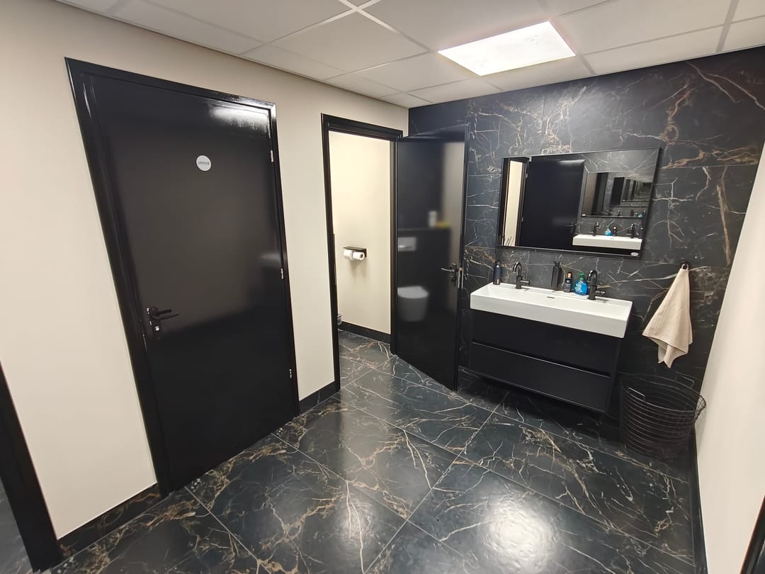 Visgraatvloer, systeemplafond met ledverlichting, pantry met koelkast, airco, zonwering en sanitaire voorzieningen.
