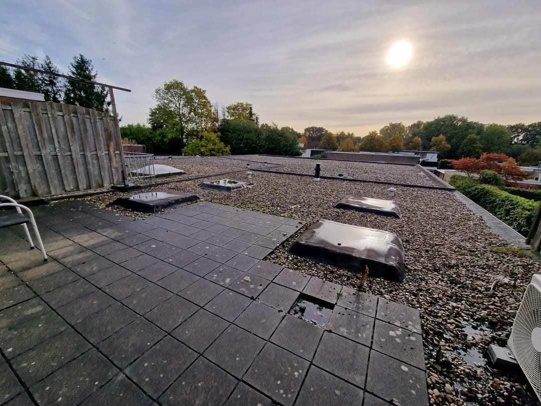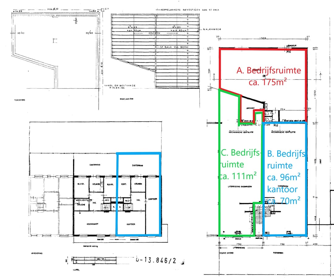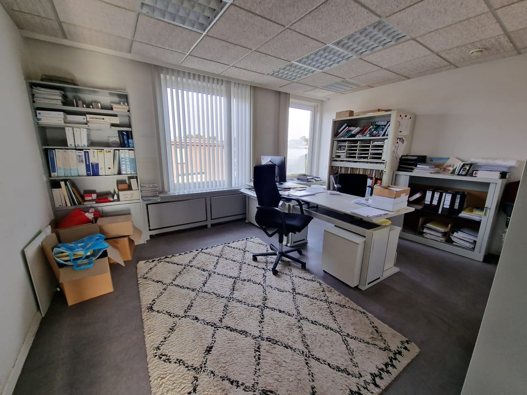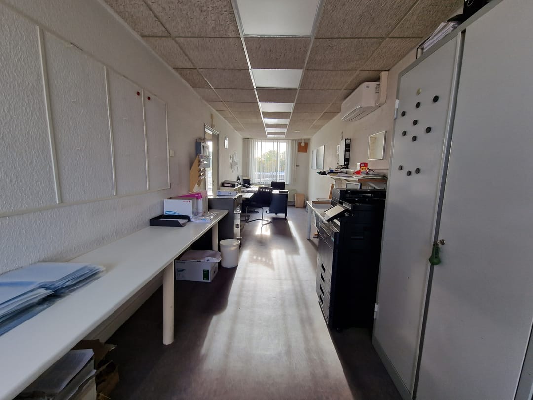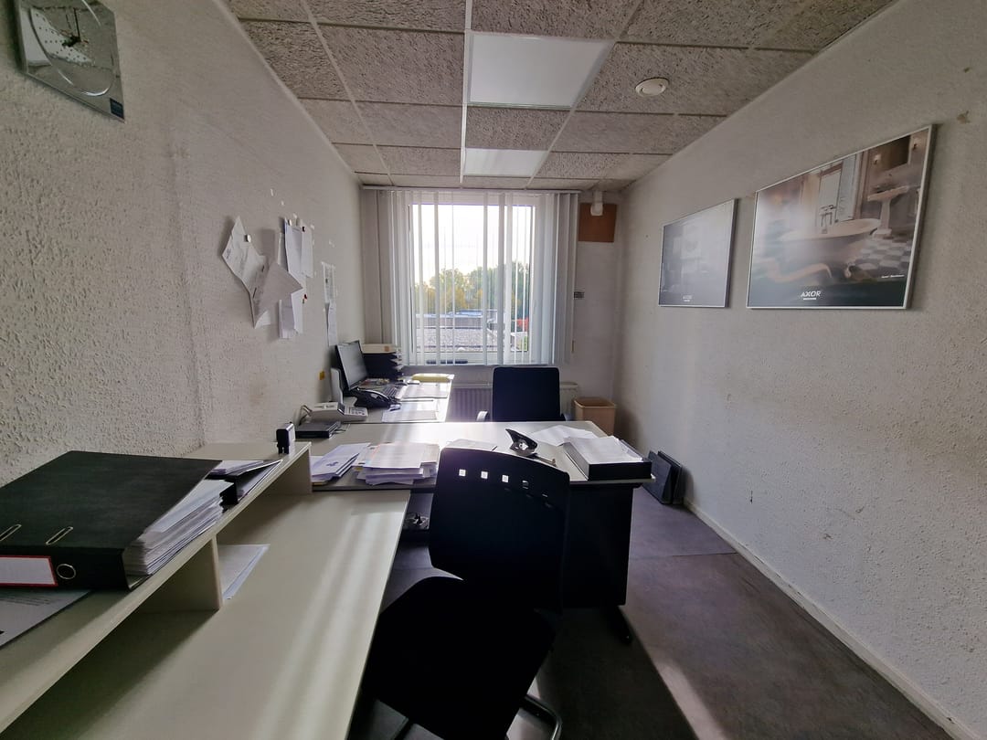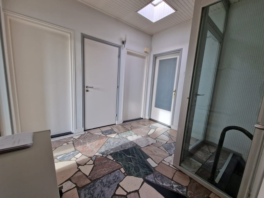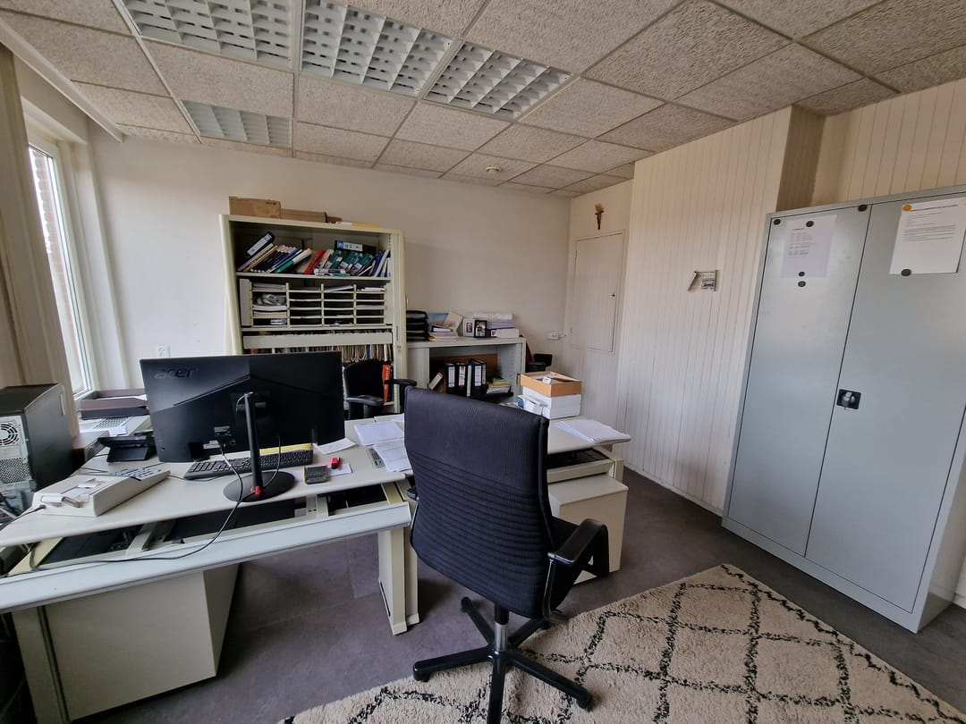 1e verdieping: hier bevinden zich een 3/4-tal kantoorkamers (totaal ca. 70 m²) met keuken en keukenblok en toegang tot het ruime dakterras, spreekkamer/kantine en een toilet.