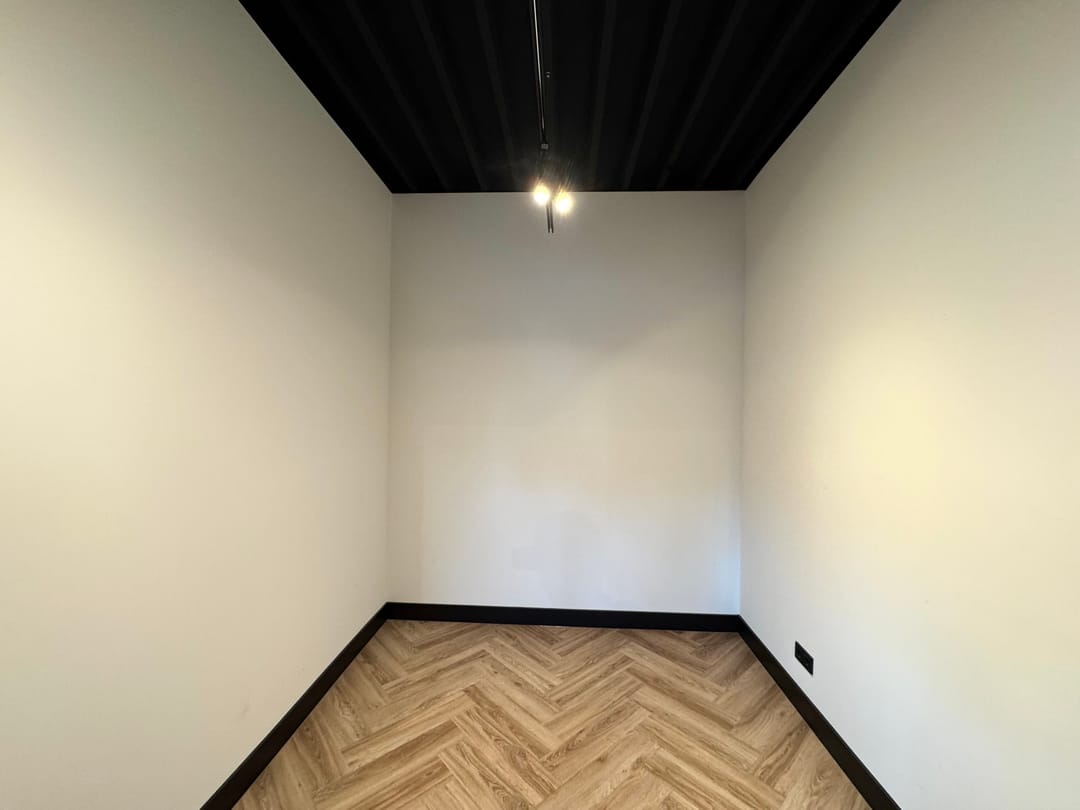 - zwart gespoten plafond met rail verlichting;