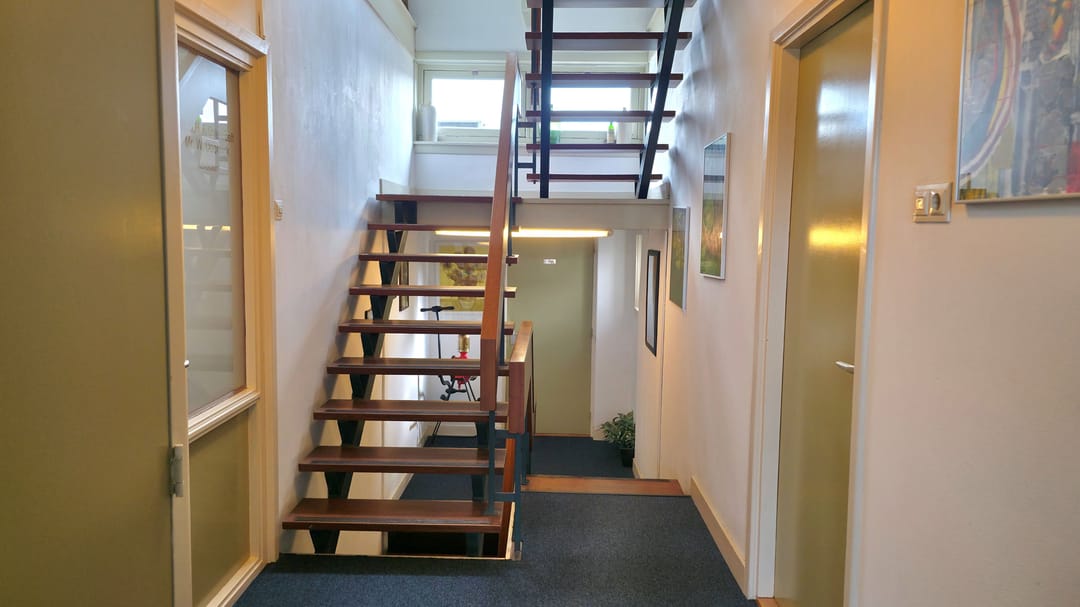 Via de hoofdentree aan de voorzijde van het gebouw komt u een karakteristieke hal binnen met een brede trapopgang naar de 1ste verdieping.