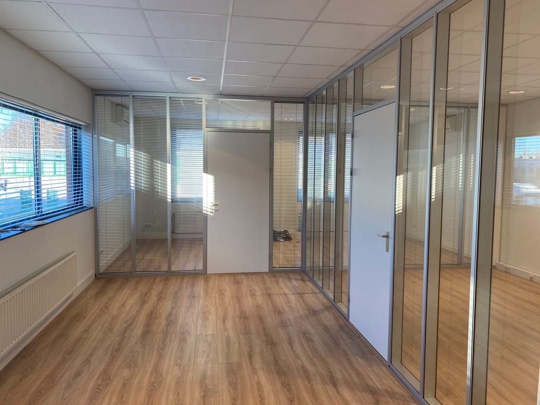 De eerste verdieping is voorzien van een ruime overloop en opgedeeld in twee ruime kantoor-/ vergaderkamers voorzien van glazen systeemwanden. Het geheel oogt bijzonder open en transparant.