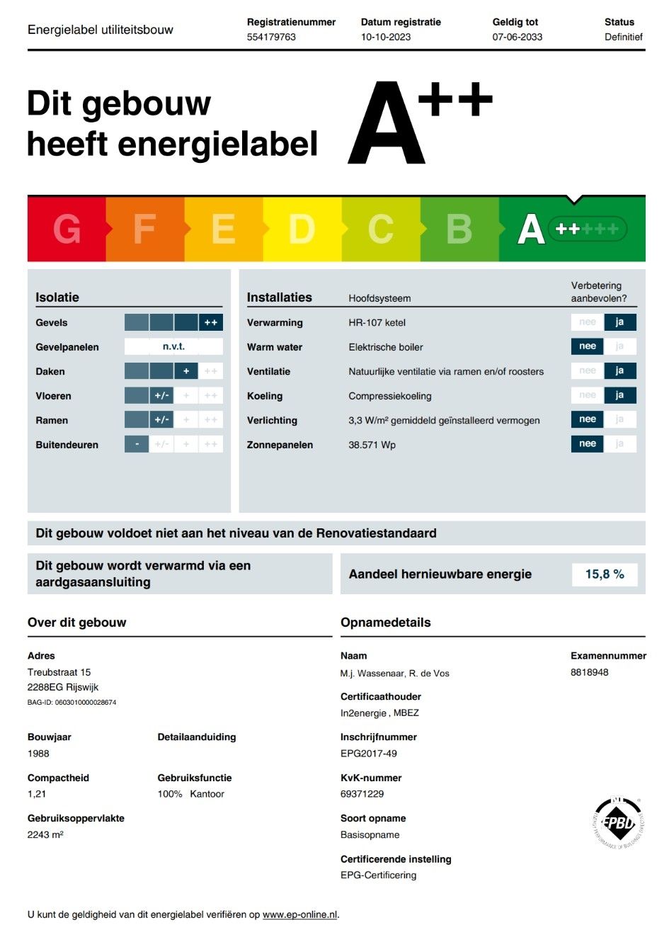Het kantoorgebouw heeft het energielabel A++, geldig tot 7-6-2033.