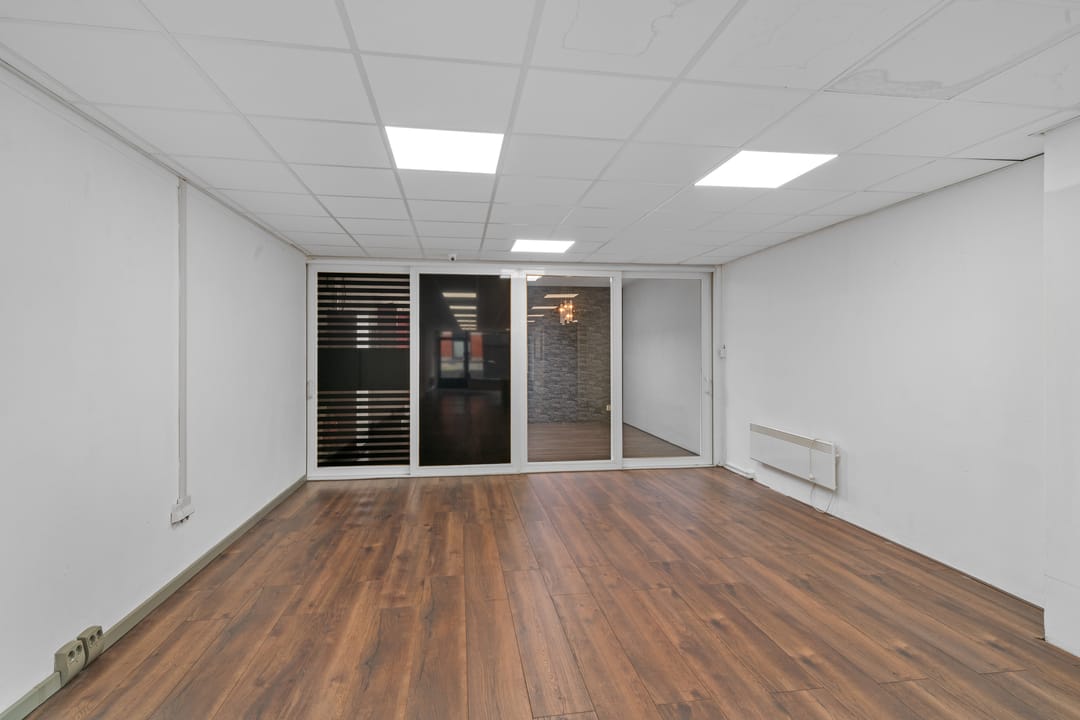 De ruimte is afgewerkt met een laminaatvloer, strak gestucte wanden, systeemplafond, LED-verlichting en aluminium kozijnen. Voorin bevindt zich de winkel-/kantoorruimte met balie en daarachter een aparte spreekkamer met dakraam. Achterin liggen de keuken/kantine (eveneens met dakraam) – voorzien van een ruim keukenblok met spoelbak en koelkast – en de magazijn-/archiefruimte met toilet. Het object is voorzien van camerabeveiliging en beschikt over energielabel A.