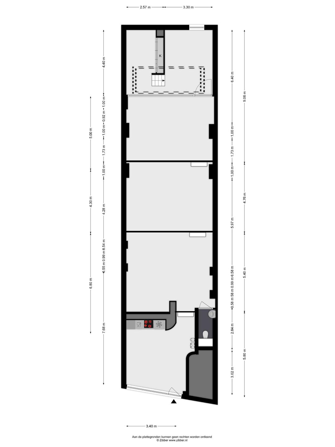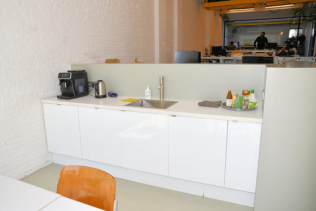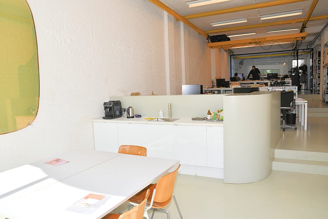 entree via geheel vernieuwde pui, ruime eetkeuken/vergaderruimte met modern wit keukenblok vzv koelkast, vaatwasser, spoelbak met mengkraan, opstap naar vloerniveau 2, toilet met hangcloset en fonteintje, werkvloer met 4 werkplekken, opstap naar vloerniveau 3 en 4, werkvloeren met beiden 4 werkplekken, door glazen scheidingswand afgesloten vergaderruimte aan de achtergevel met groot daklicht en extra raam.