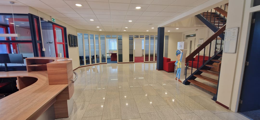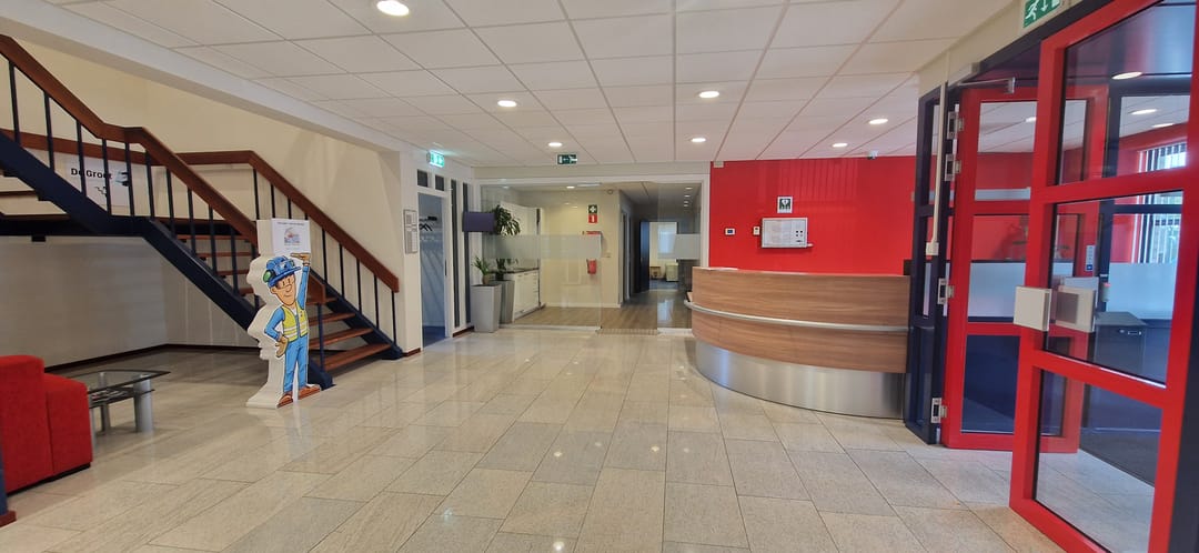 Via de hoofdentree met tochtsluis komt men in een representatieve gezamenlijke ontvangsthal met balie en natuurstenen vloer. In de “korte vleugel aan de rechterzijde” zijn 5 kantoorkamers van diverse afmetingen aanwezig. De plafondhoogte bedraagt ca. 2,7 meter. Diverse ramen zijn te openen en deels v.v. zonwering (screens). Het complex is voorzien van een inbraak- en brandmeldinstallatie, noodverlichting, brandblusmiddelen en een luchtbehandelingsinstallatie met topkoeling.
