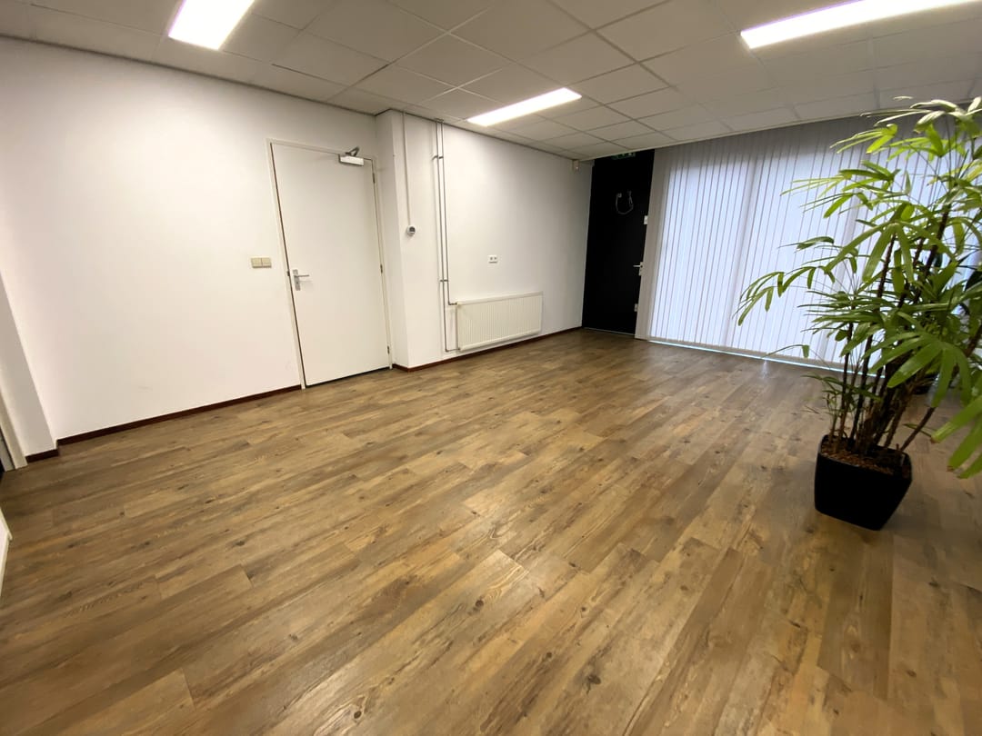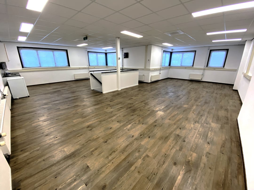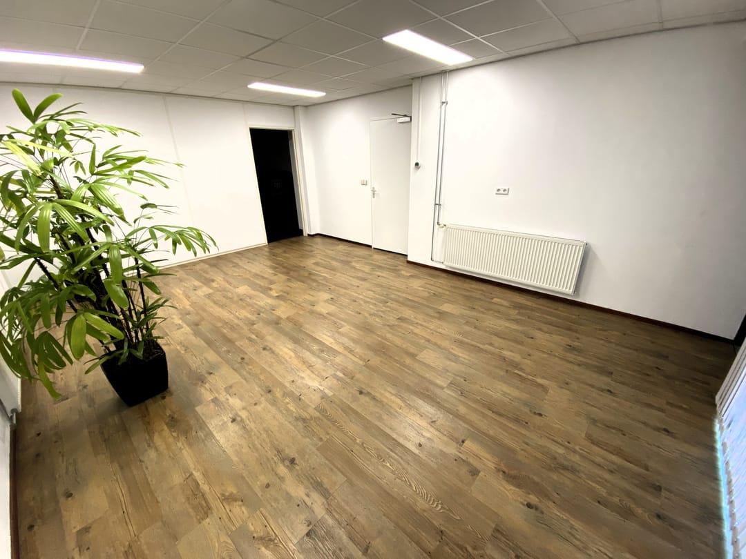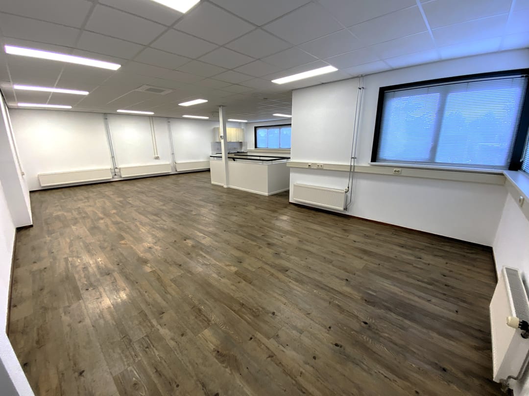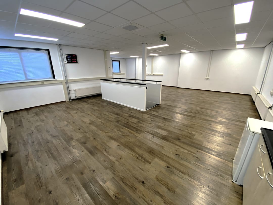 - Kantoorruimte van circa 90 m² voorzien van een systeemplafond met lichtarmaturen, laminaat en wandafwerking.