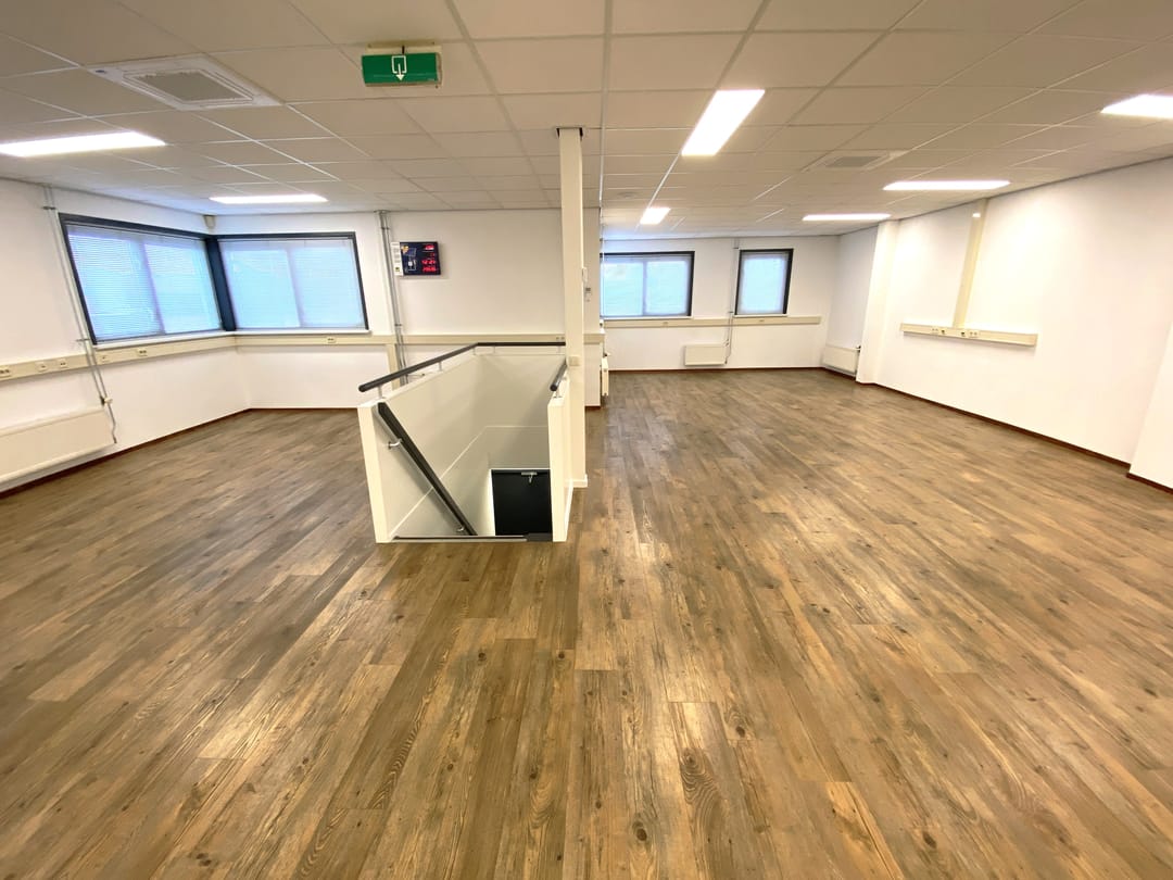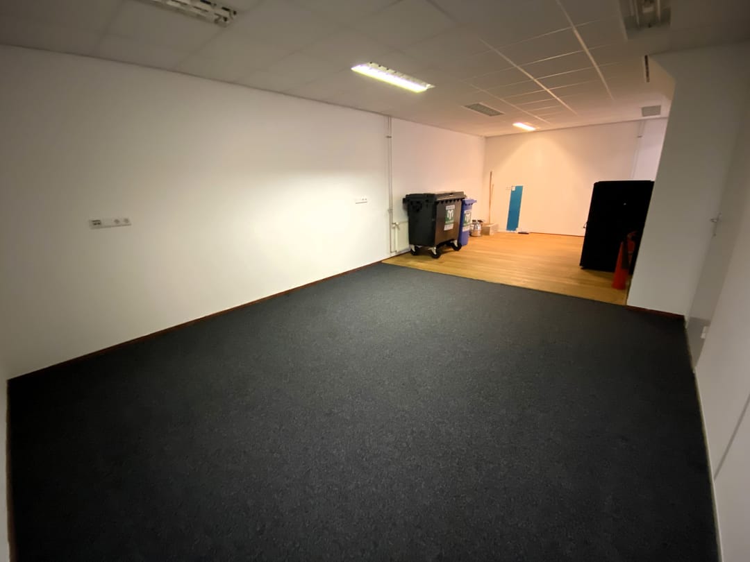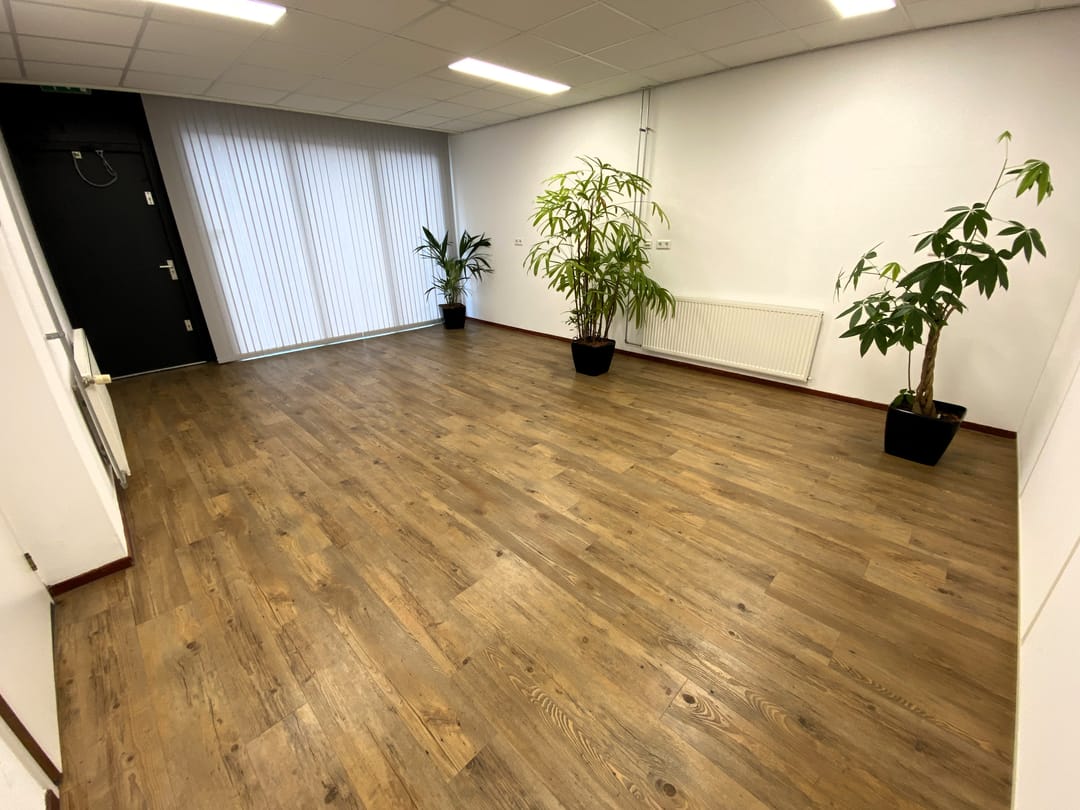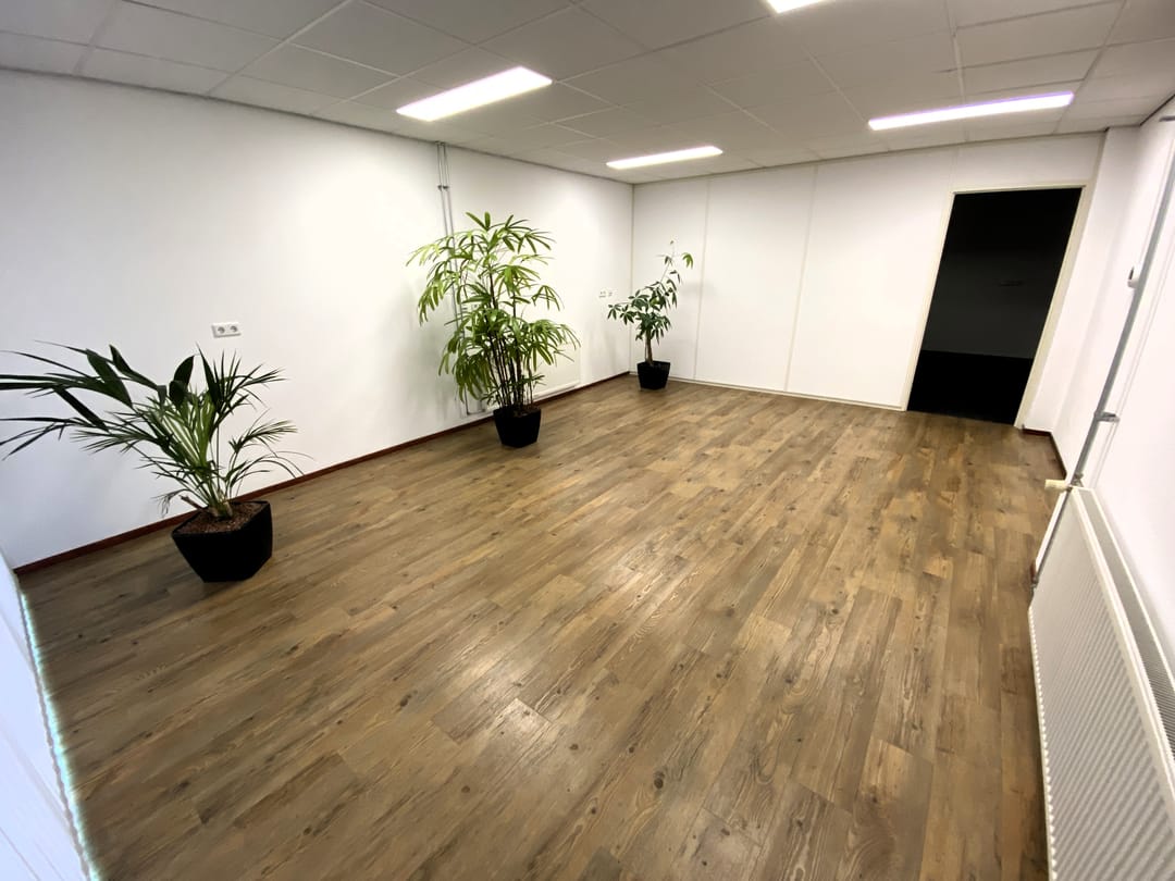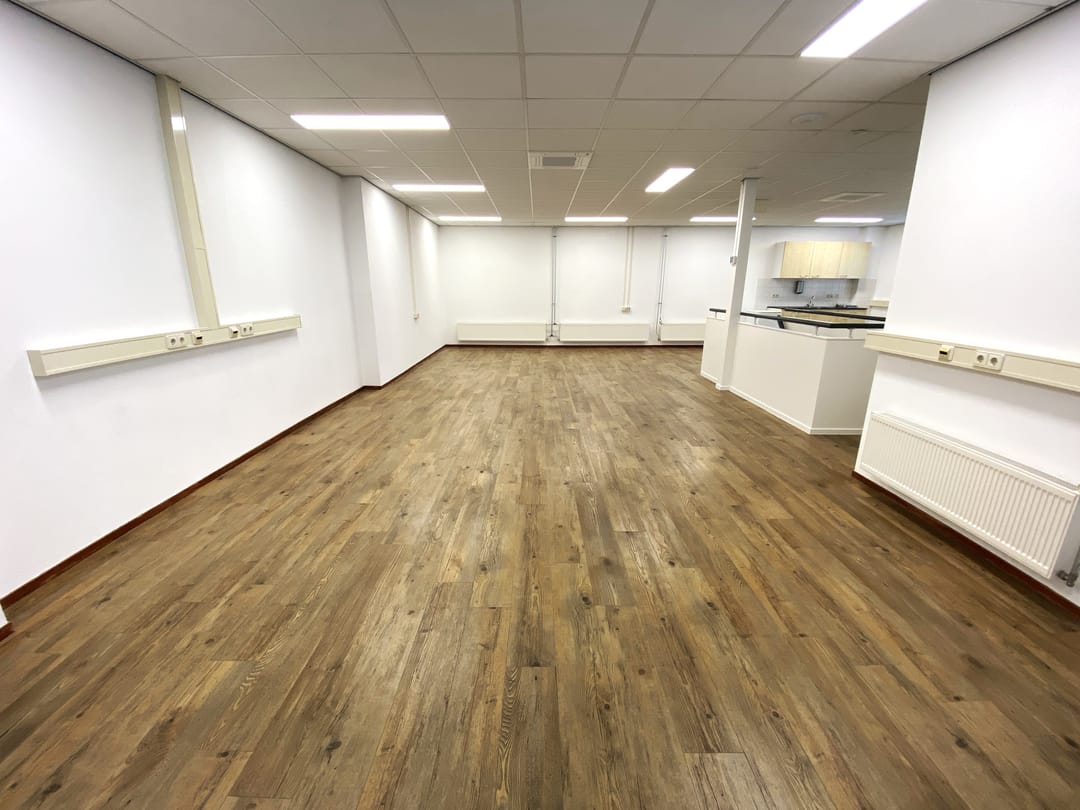 - Kantoorruimte van circa 90 m² voorzien van een systeemplafond met lichtarmaturen, laminaat en wandafwerking.
