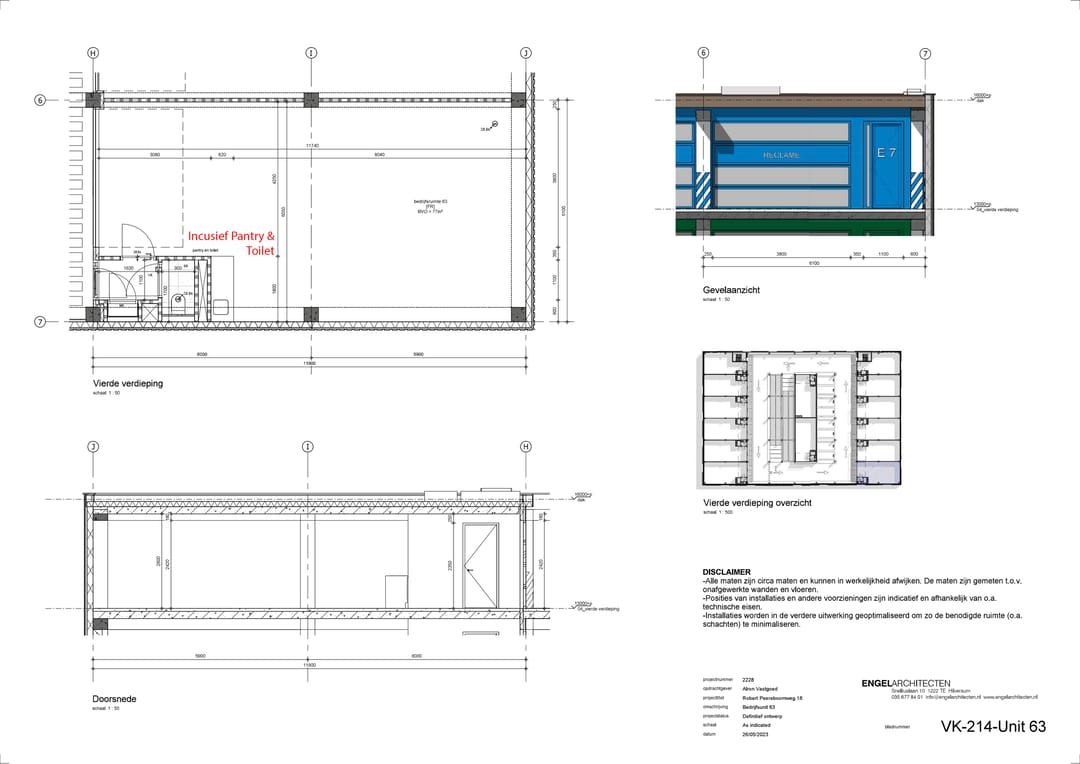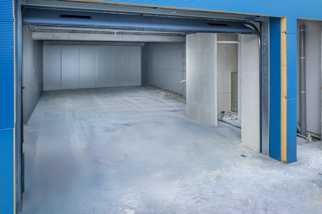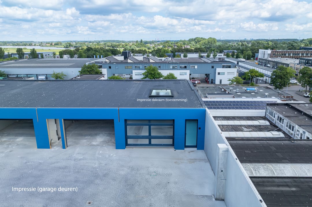De unit heeft een praktische en toegankelijke indeling met een overheaddeur en een aparte loopdeur. Daarnaast is het mogelijk om een dakraam te plaatsen voor nog meer daglicht, zoals te zien is op de impressies. De unit wordt uiteindelijk opgeleverd met een eigen pantry en toilet, waardoor het een complete en comfortabele werkruimte biedt.