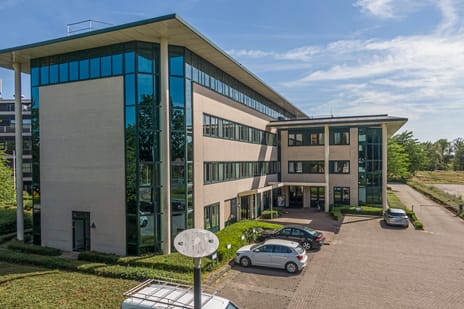 De hoogbouw bestaat uit een drietal bouwlagen met een oppervlakte van ca. 630 m2 per laag. Via de centrale toegang van de hoogbouw met balie komt men via de centrale hal direct rechts bij de kantine voorzien van een keuken met daarin opgenomen de volgende apparatuur: koelkast, magnetron, vaatwasser en elektrische kookplaat met afzuigkap. De kantine heeft middels een tweetal schuifpuien toegang tot een terras. De centrale hal geeft verder toegang tot de gescheiden toiletgroepen, miva-toilet, trap naar de eerste verdieping, berging, rookruimte, serverruimte. Verder is de begane grond ingedeeld met een kantoortuin en een zestal kantoren/spreekkamers. Helemaal aan de achterzijde bevindt zich een trappenhuis met buitendeur.