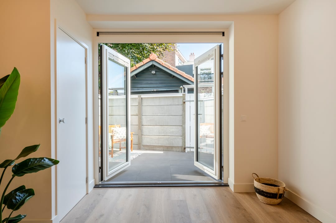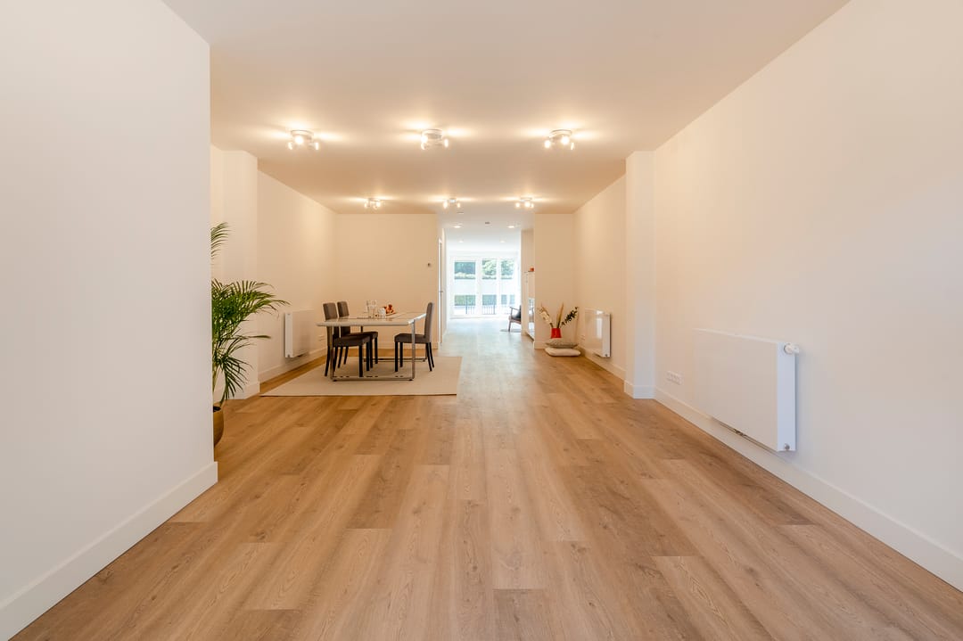 Via de gezamenlijke voortuin bereikt u de entree die een volledige glazen pui heeft welke is voorzien van een loopdeur. Bij binnenkomst valt direct de smaakvolle en kwalitatief hoogwaardige afwerking op en het open karakter van de ruimtes, welke zijn voorzien van functionele en sfeervolle verlichting.