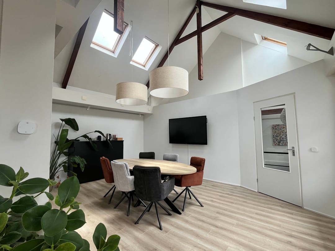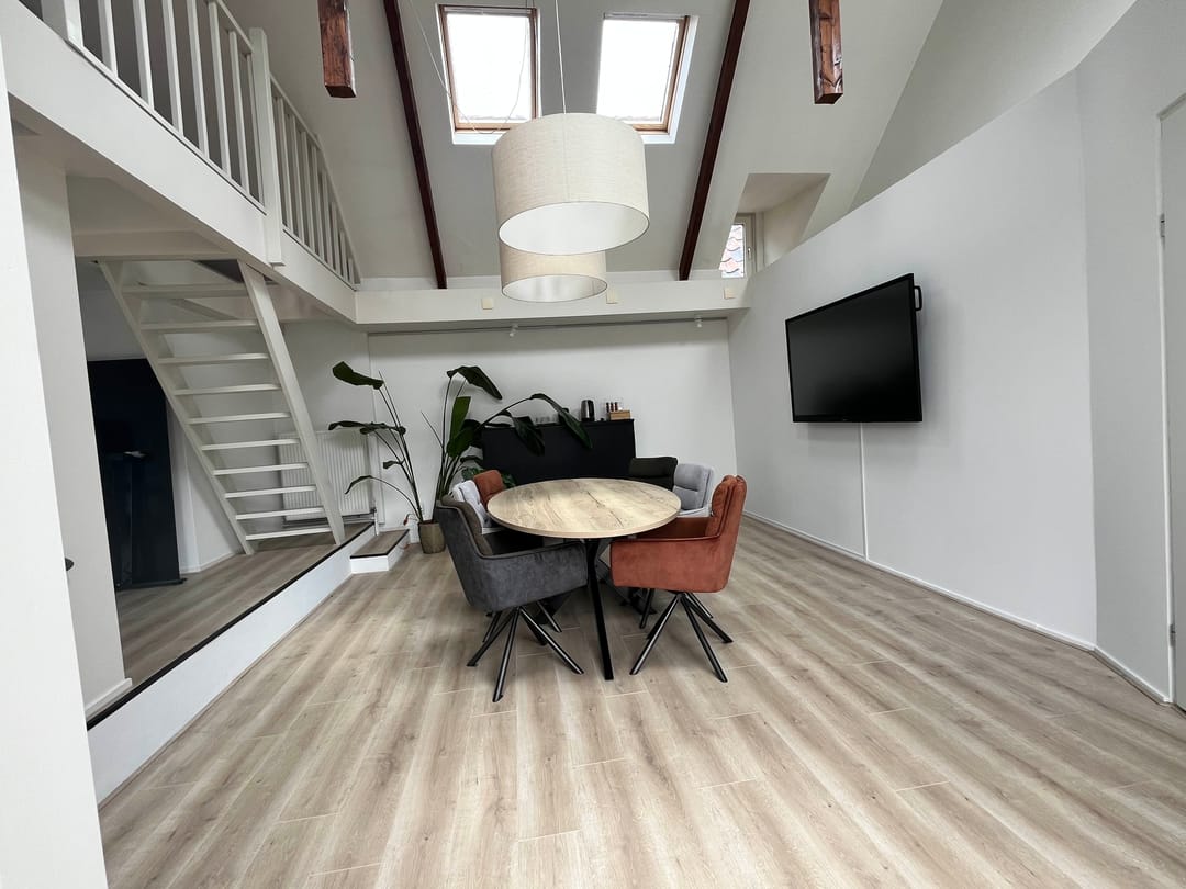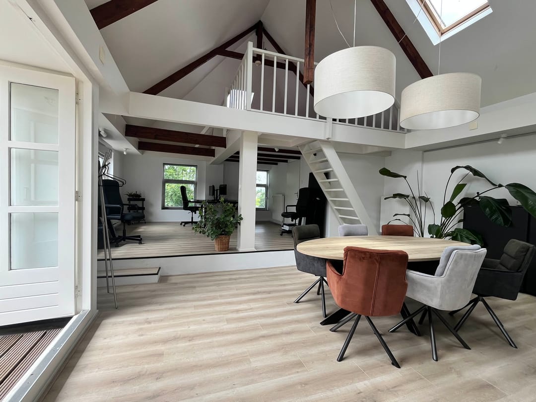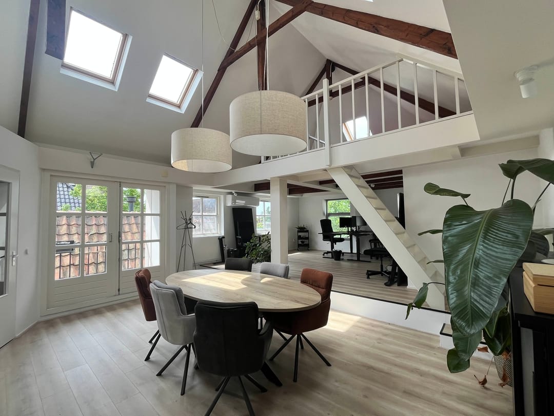 Te Huur op de 2e verdieping werkruimte van ca 52 m2 met veel licht inval, berging van ca 7 m2, entresol van 13 m2, loggia met openslaande deuren. Geheel voorzien van dubbel glas, geïsoleerd dak en muren afgewerkt met laminaatvloeren.