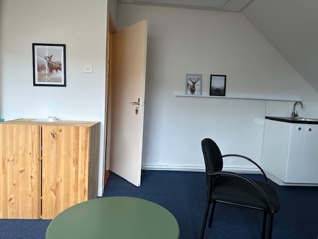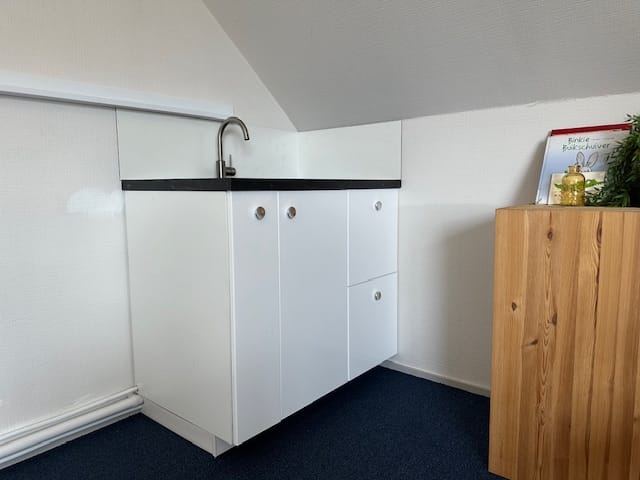 De kamer beschikt over een frisse lichte werkplek met tl-verlichting, pantry en airco-unit.