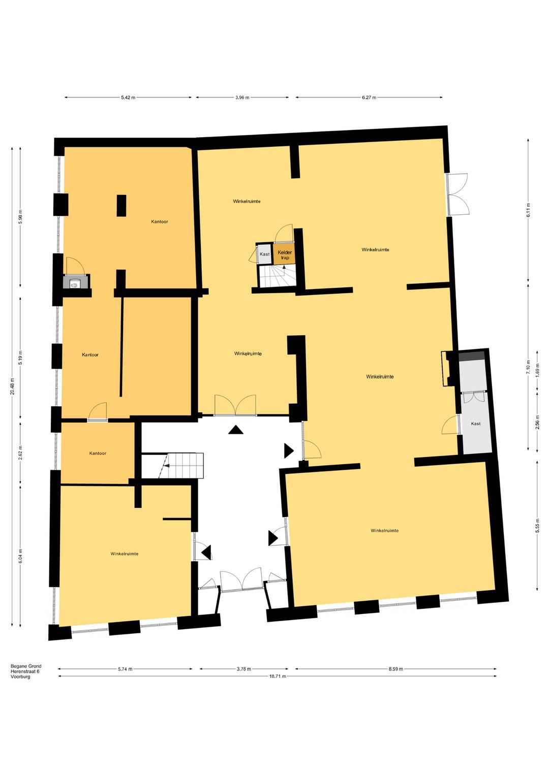 Op de begane grond bevindt zich de commerciële ruimte van ca. 338,1 m² b.v.o., zowel geschikt voor winkel- als kantoorruimte. De entree bevindt zicht centraal in de voorgevel. Achter de entree bevindt zich de gemeenschappelijke hal, welke toegang geeft tot de winkel-/kantoorruimte en opgang naar bovengelegen verdiepingen (appartementen).